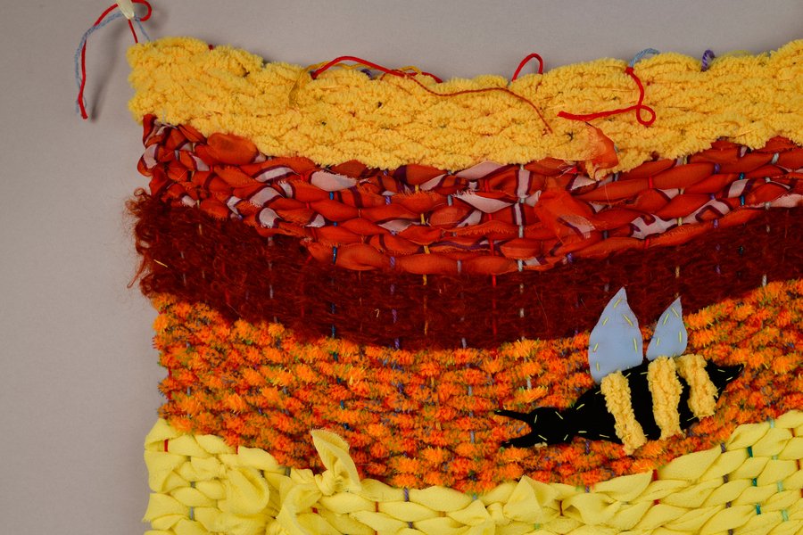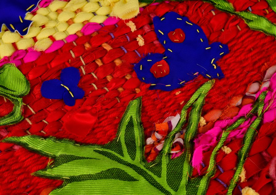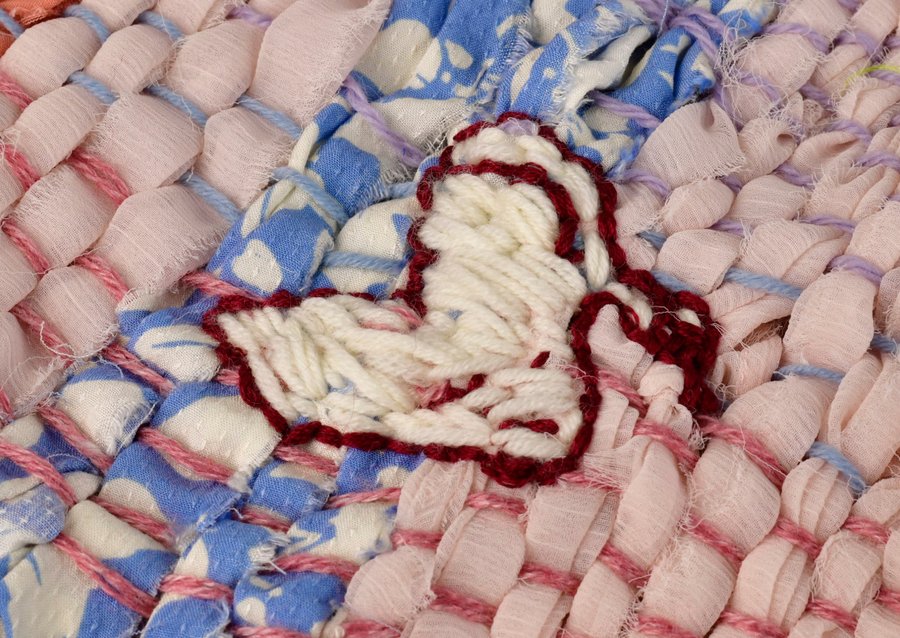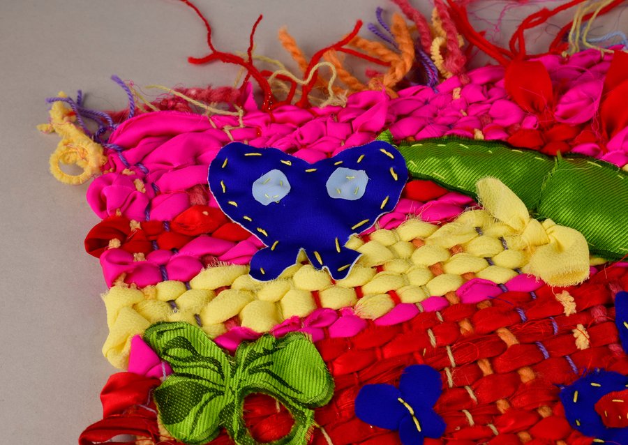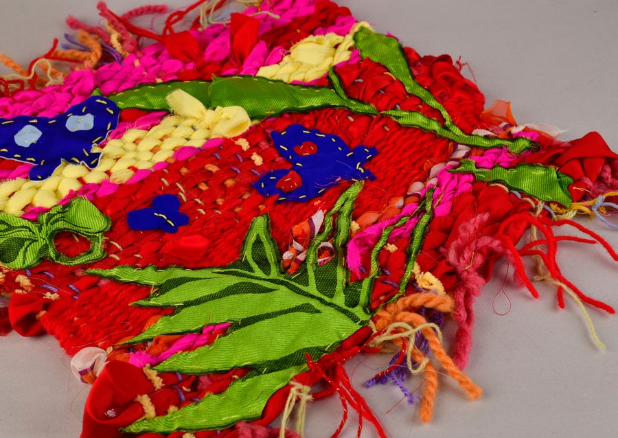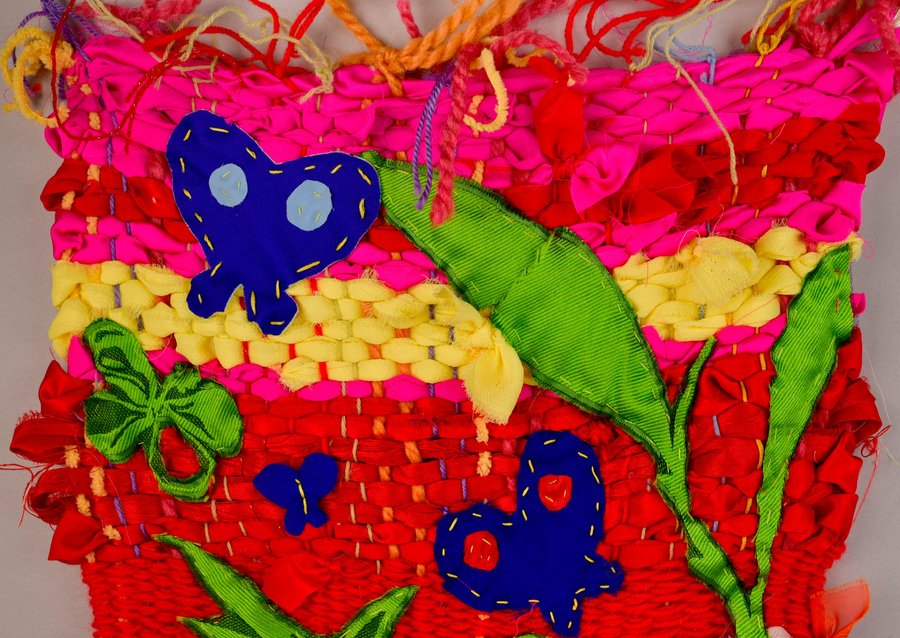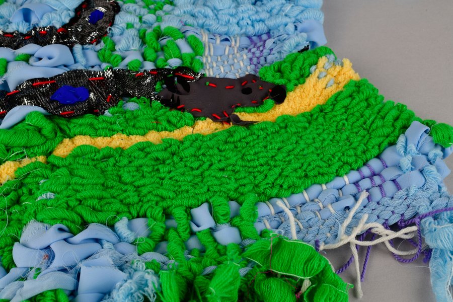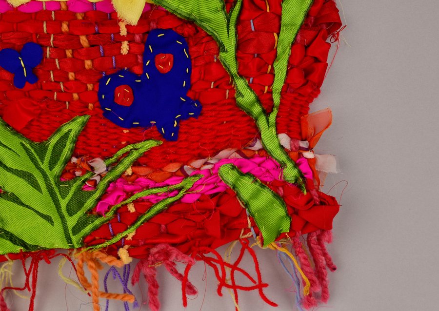 «Детство на нитке» — это серия гобеленов, сотканных из обрезков маминых тканей и пряжи с элементами вышивки и текстильной аппликации, образы и сюжеты которых вдохновлены детскими рисунками