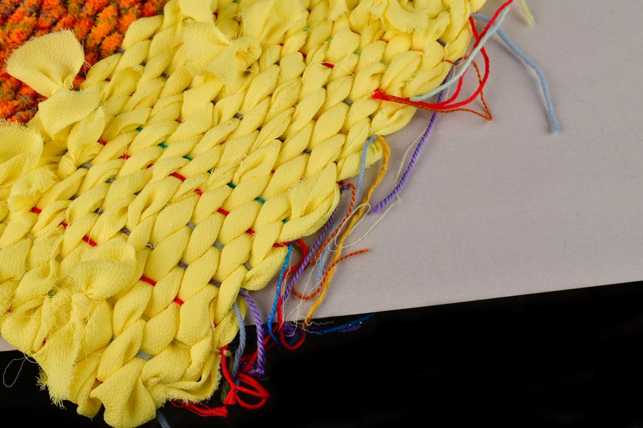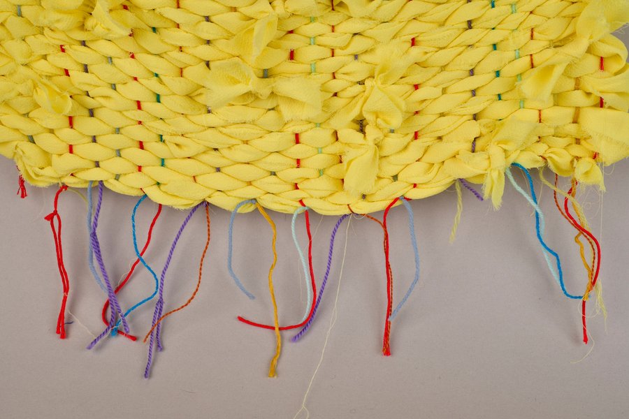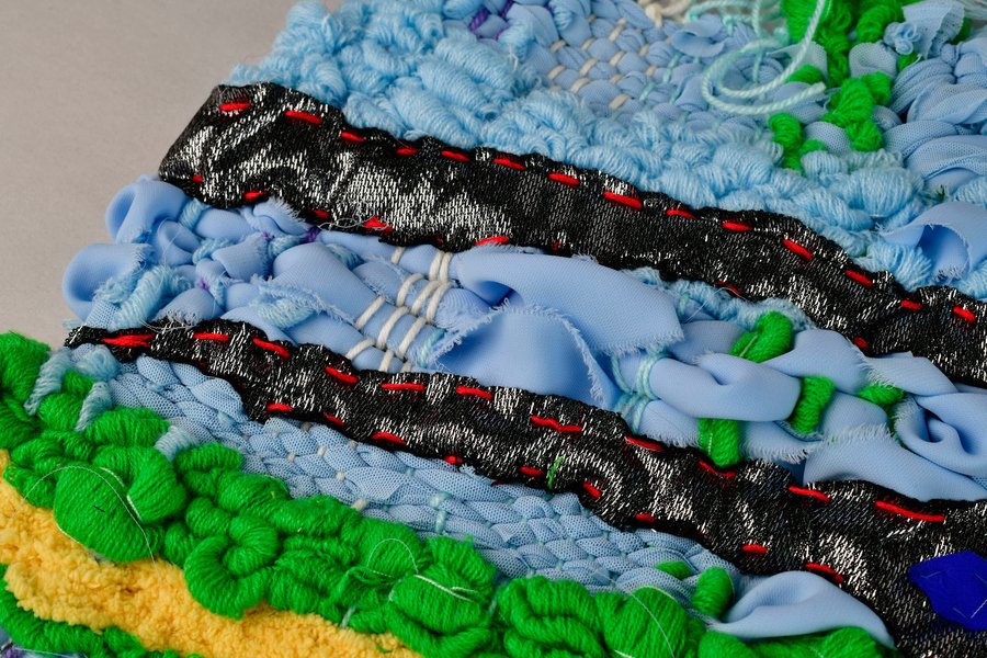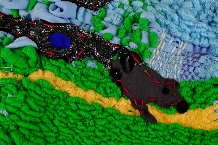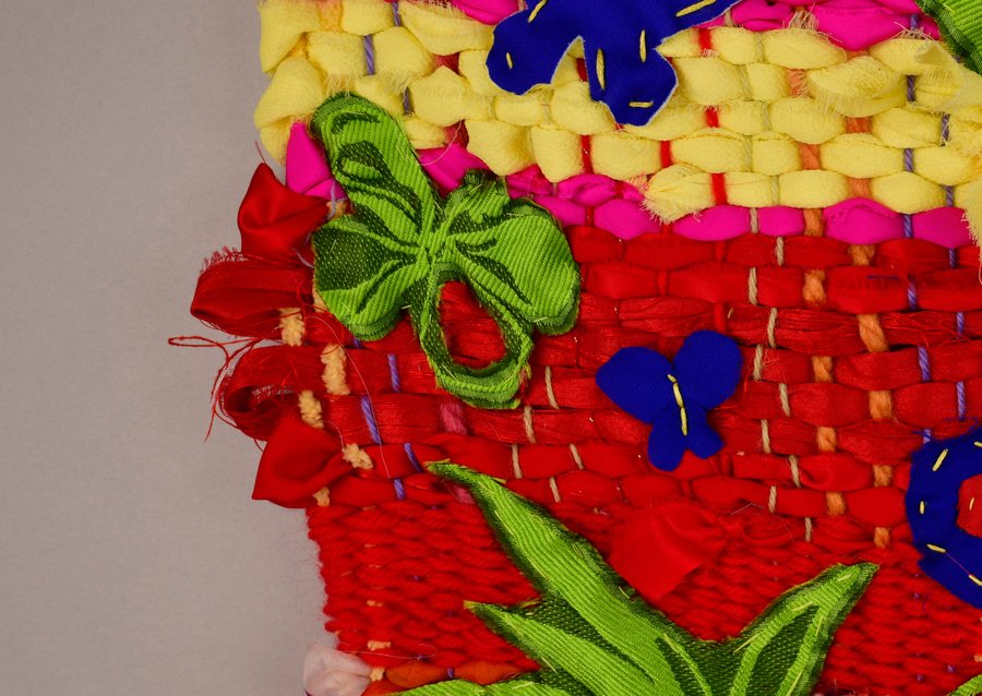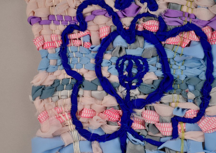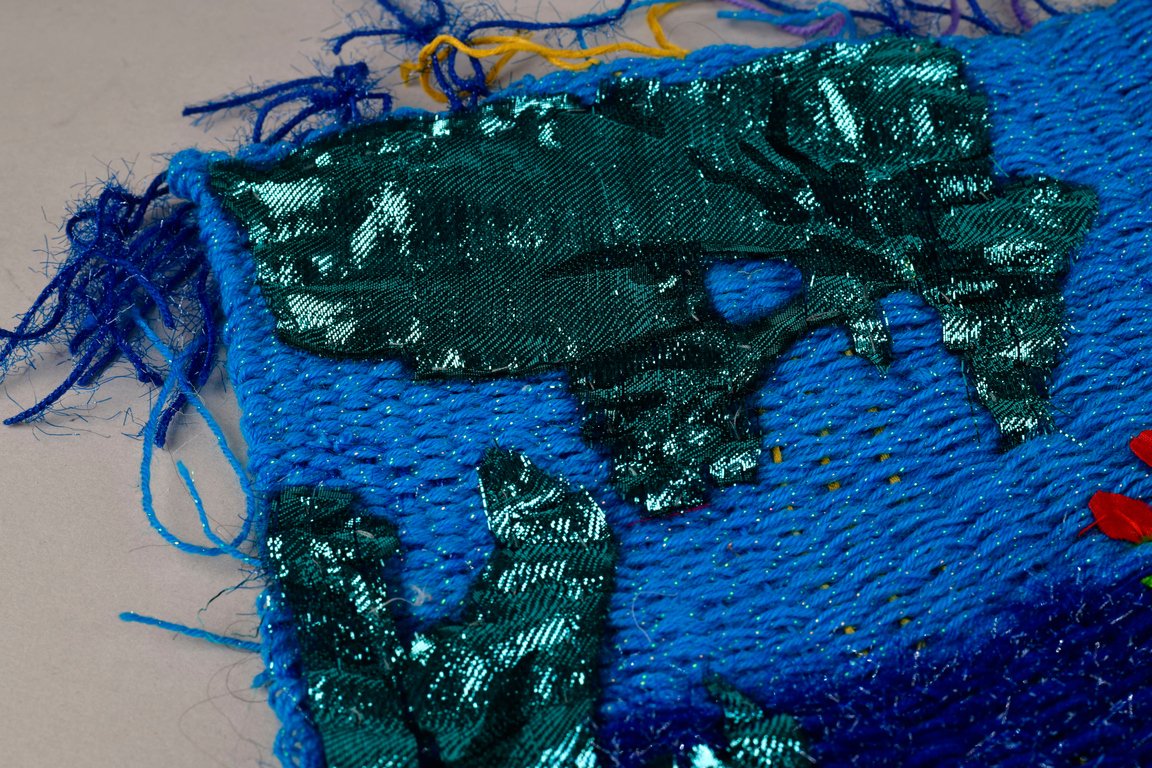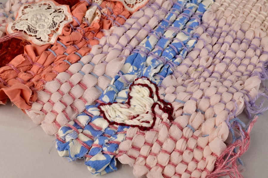 «Детство на нитке» — это серия гобеленов, сотканных из обрезков маминых тканей и пряжи с элементами вышивки и текстильной аппликации, образы и сюжеты которых вдохновлены детскими рисунками