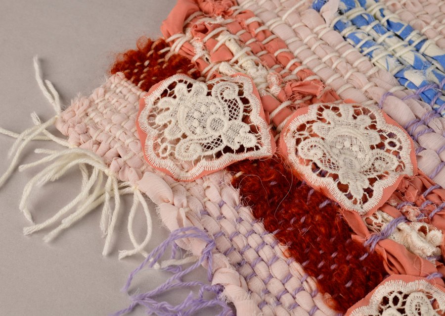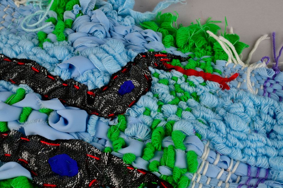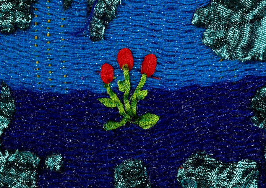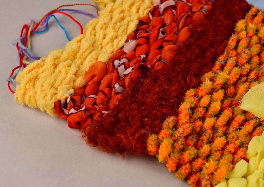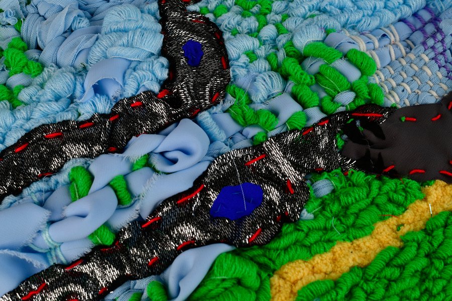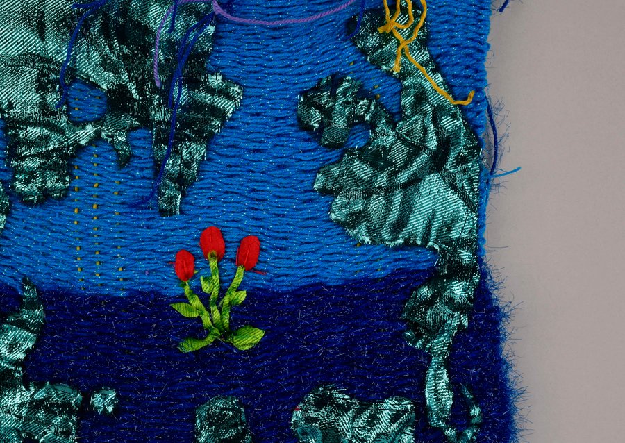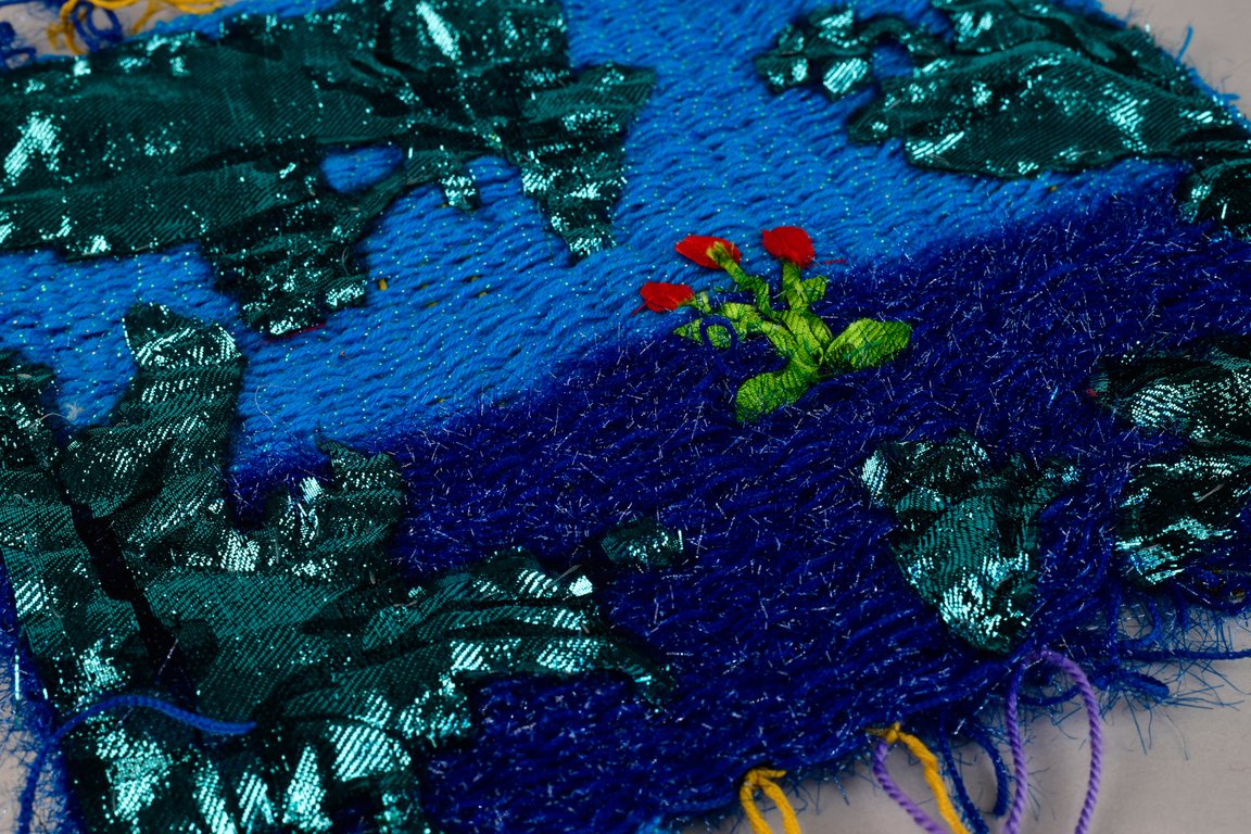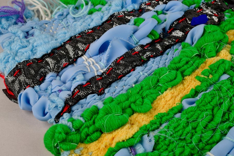 «Детство на нитке» — это серия гобеленов, сотканных из обрезков маминых тканей и пряжи с элементами вышивки и текстильной аппликации, образы и сюжеты которых вдохновлены детскими рисунками