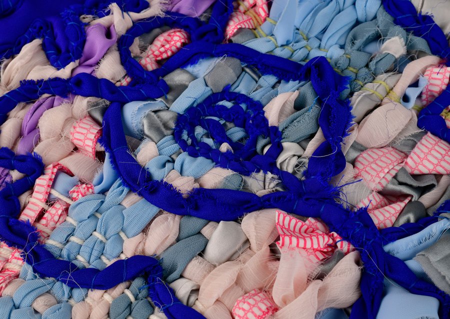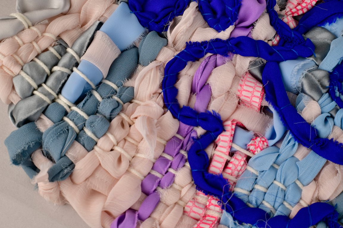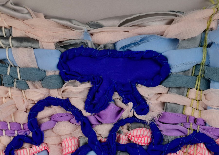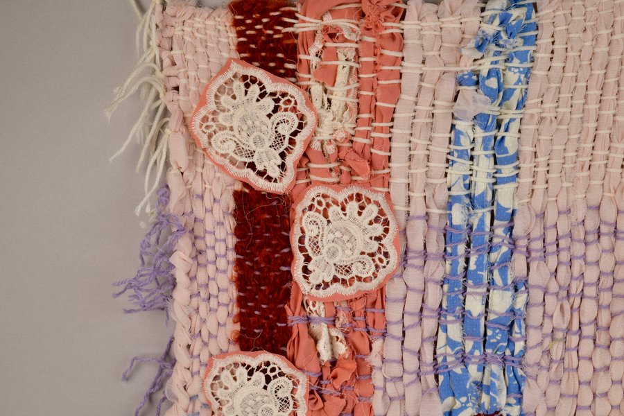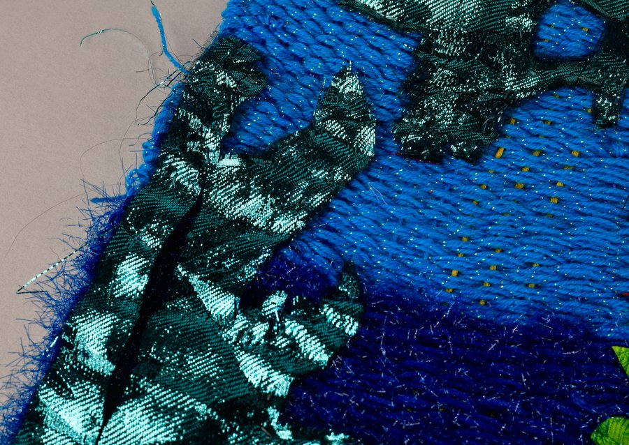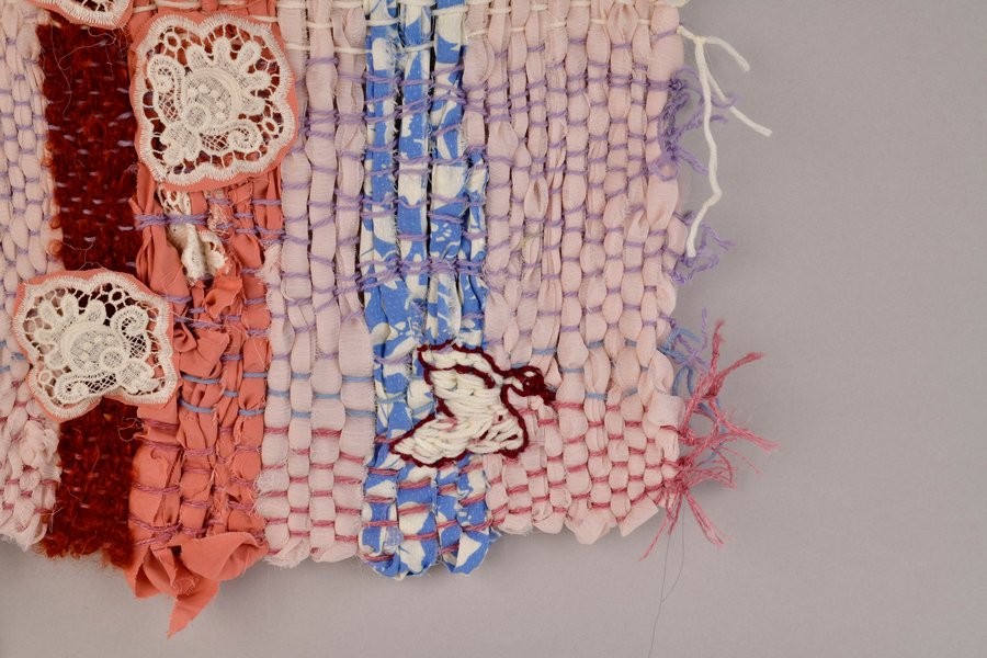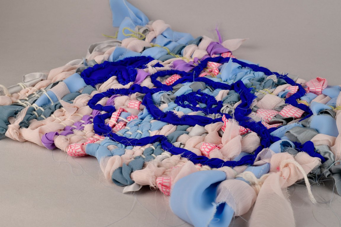 «Детство на нитке» — это серия гобеленов, сотканных из обрезков маминых тканей и пряжи с элементами вышивки и текстильной аппликации, образы и сюжеты которых вдохновлены детскими рисунками