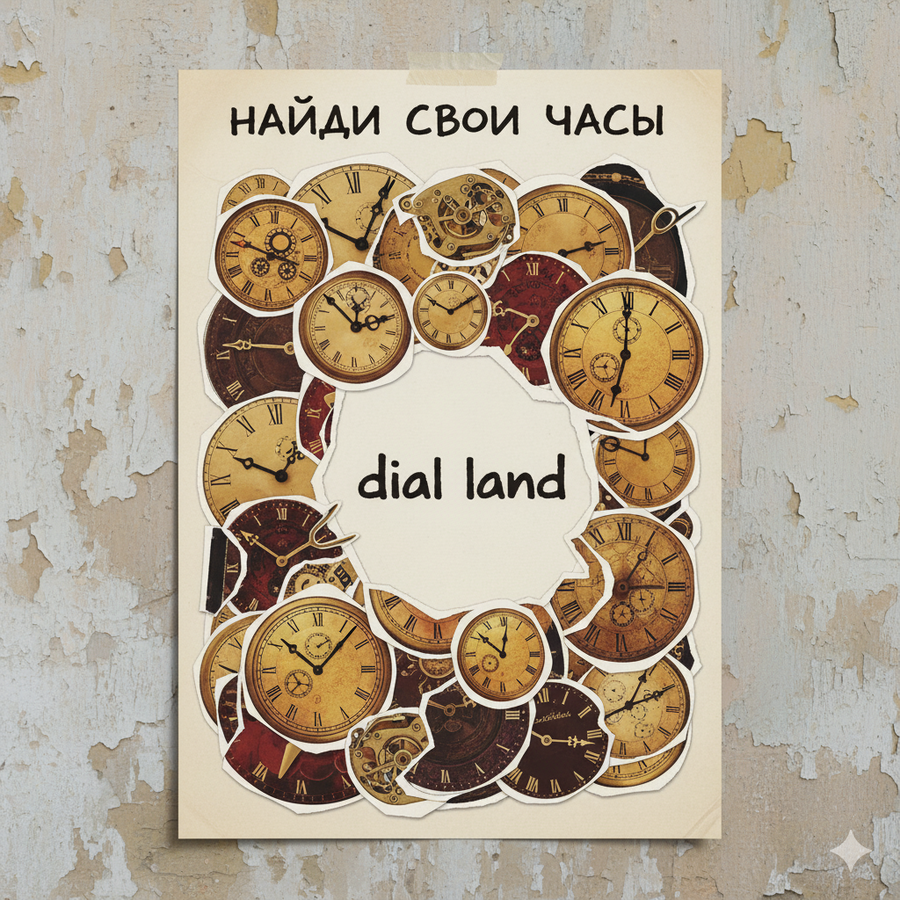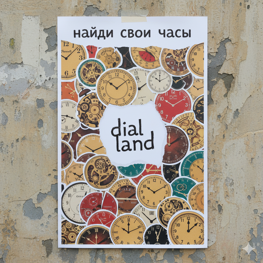 промпт для второй серии: Photorealistic A3 poster hanging on rough gray urban wall. Top third features handwritten «dial land» logo in marker style. Lower two-thirds show grid of 12 square photos of different clock dials — vintage, modern, industrial, colorful — arranged like Polaroid pictures stuck on the poster. Each dial is unique in style and era. Text at bottom: «Ваши часы ждут» in casual handwritten Cyrillic. The poster has realistic texture, slight wear, and natural urban lighting.
