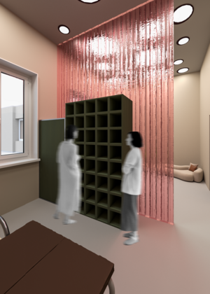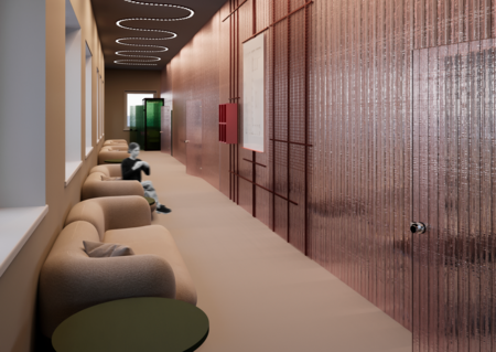 Основой является продуманный баланс: нейтральная, успокаивающая база в виде бежевых и песочных тонов стен и пола создаёт ощущение тепла, стабильности и визуального простора, что способствует снижению тревожности и позволяет студентам долго сохранять концентрацию. При этом стимулирующие, но не агрессивные акценты в мебели (терракотовые, оливковые) — вносят необходимый импульс энергии, пробуждают творческое мышление и не дают пространству стать монотонным.