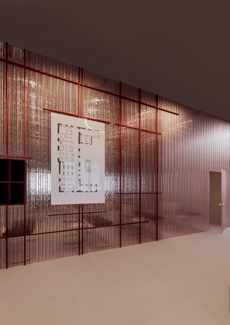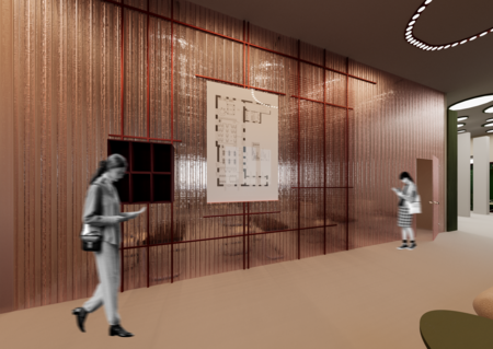Также предусмотрена зона для работ студентов. На сетку можно развесить фотографии работ, далее располагается доска для заметок и рисунков, а за ней расположены полки, куда можно поставить небольшие макеты.