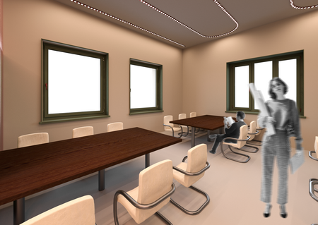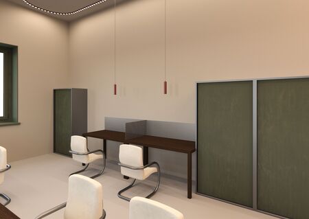 Кабинет преподавателей разделен на две секции. В первой располагаются рабочие столы и шкафы для хранения. За стеклянной перегородкой находится отдельная зона отдыха, где есть удобные диваны, Большой стол для приема пищи и зона для заметок и важной информации