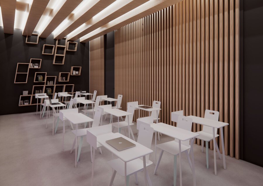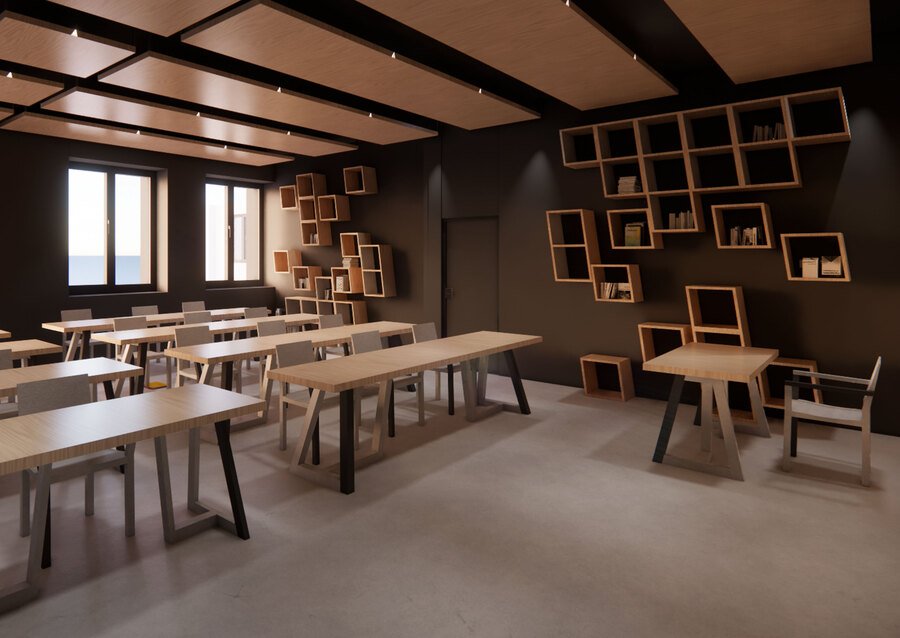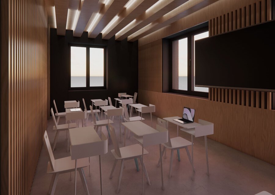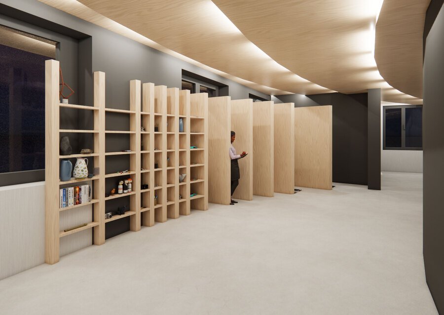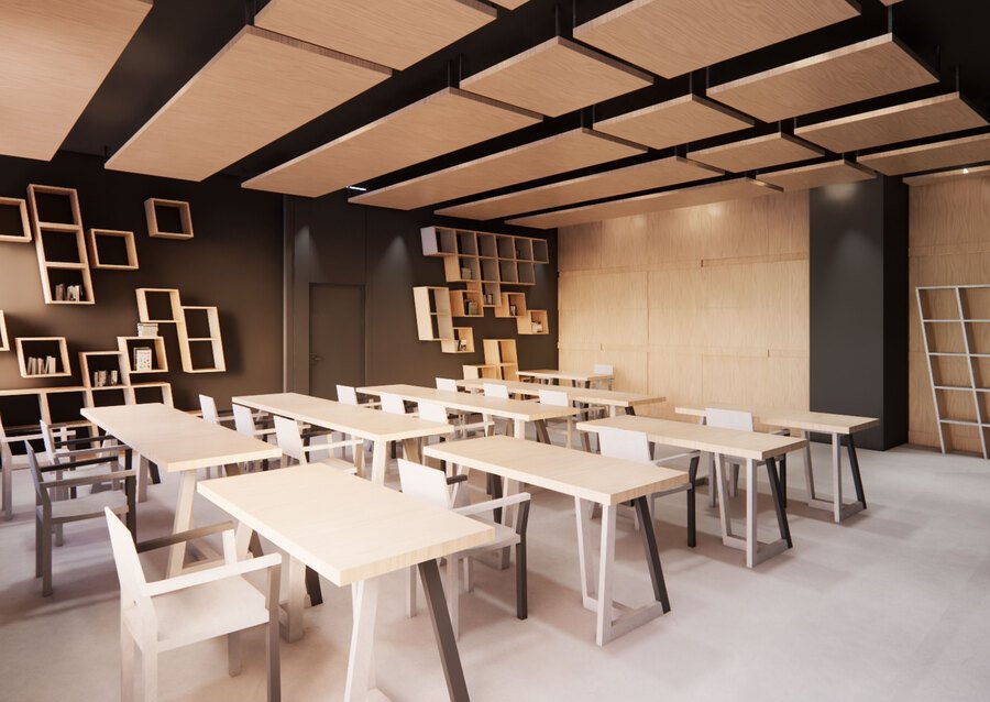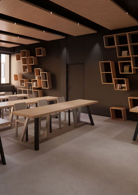 Дизайн проект учебного кластера среды и интерьера в школе дизайна HSE ART and Design School. Пространство минималистично и выразительно благодаря сочетанию черного и белого цветов и древесины. Основное внимание уделяется поверхностям потолков и стен, создающим динамичную текстуру интерьера
