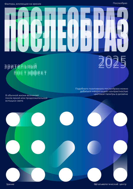 Послеобразы бывают положительными и отрицательными. При работе над плакатом я решила задуматься и визуализировать, как знание послеобраза и его действия может быть использовано в дизайне в положительном ключе. С его помощью дизайнеры могут создавать эффект долговременного впечатления у зрителей, при этом не всегда используя свет. Контрастность цветовой палитры может послужить основным инструментом до достижения цели и положительного постэффекта. С помощью постэффекта можно воздействовать на память человека и выделяться на фоне непримечательных реклам и визуального шума.