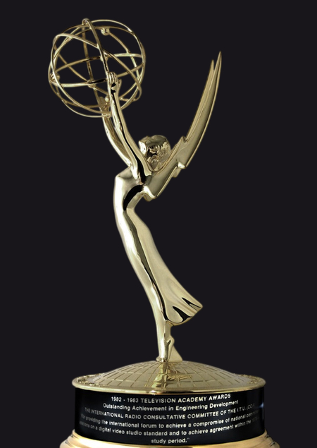 Статуэтку «Эмми», изображающую крылатую женщину, держащую атом, разработал телевизионный инженер Луи Макманус, который использовал свою жену в качестве модели. Телевизионная академия отклонила в общей сложности сорок семь предложений, прежде чем остановиться на дизайне Макмануса в 1948 году. Именно эта статуэтка, выполненная в виде ангела с крыльями, символизирующего музу искусства, которая держит в руках атом в окружении электронов как символ науки и технологии, по замыслу авторов стала говорить, что телевидение это синтез искусства, науки и технологий. Каждая статуэтка весит 3,08 килограмма, изготовлена из сплава меди, никеля, серебра и золота и высотой 39 сантиметров.