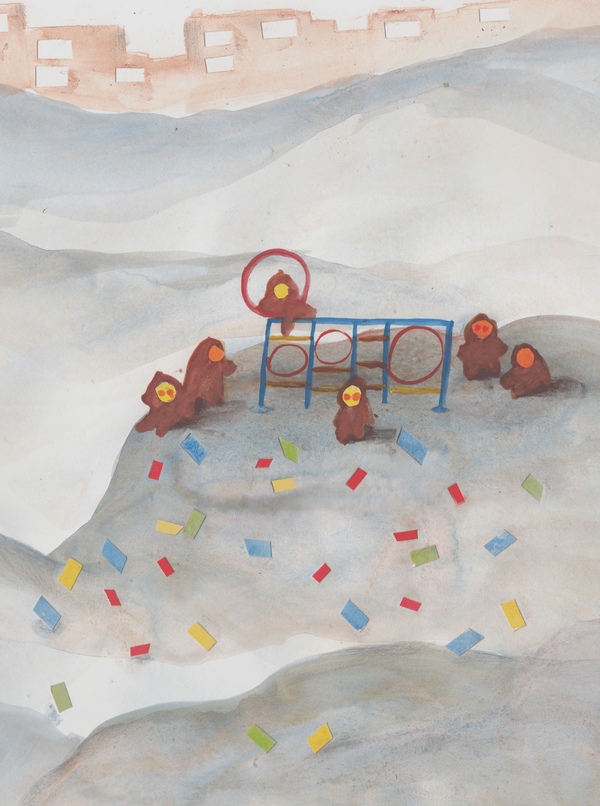 У меня среднестатистический двор в первую очередь ассоциируется с детством, а потому в своих работах я пользовалась техникой аппликации, так как мне кажется что она, в паре с аквалерю, придает рисункам настроение детской беззаботности