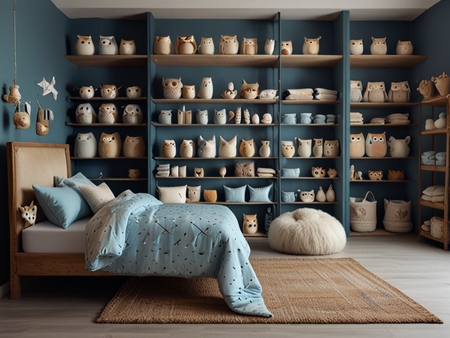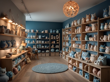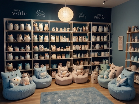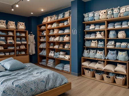 ПРОМПТ: A store of sleep goods with a window in delicate blue and beige shades. On the shelves there are blankets with owls, pillows with owls, slippers with owls, silicone nightlights in the form of plump owls, flower ceramic pots in the form of owls. The inscription on the wall: The world of dreams.