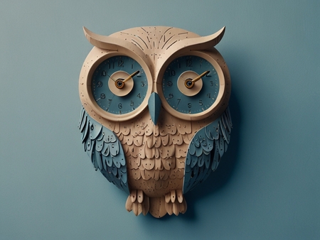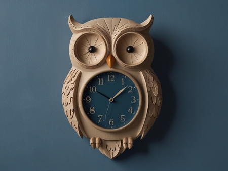 ПРОМПТ: Beige clock in the shape of an owl on a blue wall background.