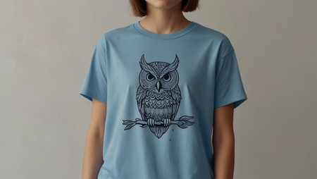 ПРОМПТ: A T-shirt in blue shades with a print in the form of a minimalistic owl and feathers. The background is a white wall.