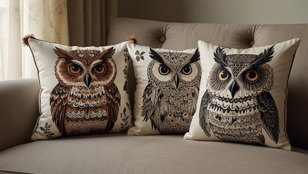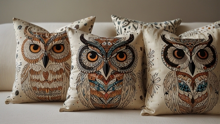 ПРОМПТ: Pillows with a pattern of owls and feathers.