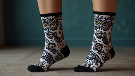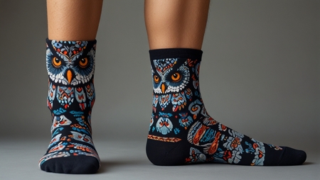 ПРОМПТ: Socks with a pattern of owls and feathers.