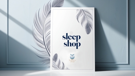 ПРОМПТ: A white poster with a vector feather pattern with the text «Sleep Shop». Blue wall background