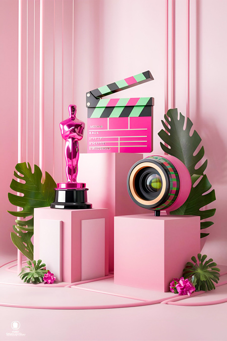 Также для создания обложки проекта я использовала сайт ideogram. - prompt: 3 minimalistic pedestals. on the first one there is an oscar, on the second one there is a clapperboard. on the third one there is a lens of a camera. color palette is shades of green and pink, 3d render, cinematic - картинка
