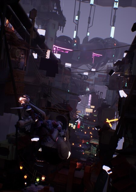 При подборе визуального стиля хотелось соединить грубость и суровость с живописностью. Было решено использовать лоу-поли модели, а архитектуру выполнить так, чтобы она напоминала скорее собранный из чего попало конструктор. Живописность же реализована с помощью hand-paint текстур, которые подчёркивают атмосферу подверженного дождям и океанической влажности города.