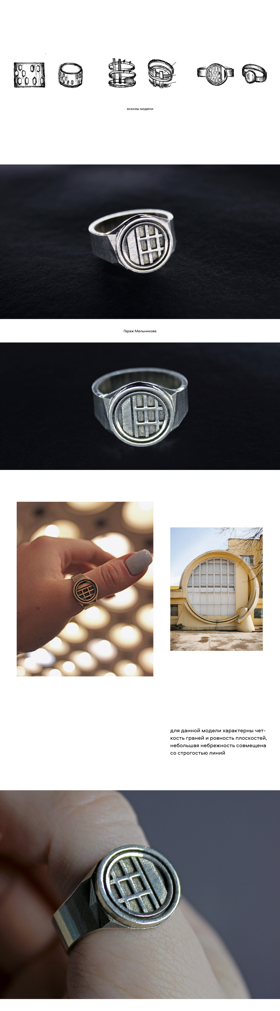 Серия украшений, вдохновленная формами и пластикой зданий эпохи конструктивизма. В основу были взяты здания данного направления и интерпретированы под форму ювелирных колец. Были сохранены особенности конструктивистского стиля, а главное дух и атмосфера этого направления.