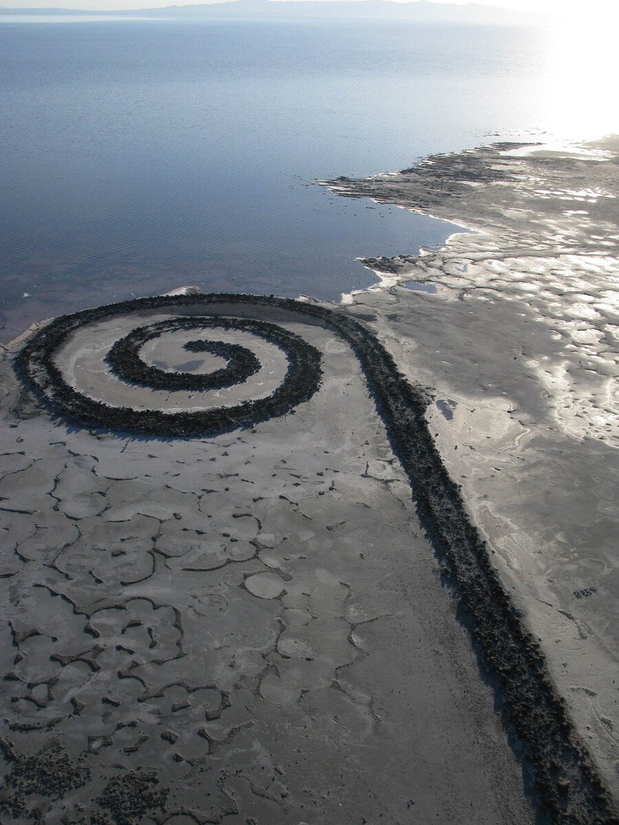 Robert Smithson’s Spiral Jetty is one of the most iconic and influential works in the history of ecological and land art. Created in 1970 on the northeastern shore of the Great Salt Lake in Utah, the artwork is a massive spiral-shaped jetty made of mud, salt crystals, basalt rocks, and water. It stretches approximately 1,500 feet into the lake and coils counterclockwise from the shore into the water.