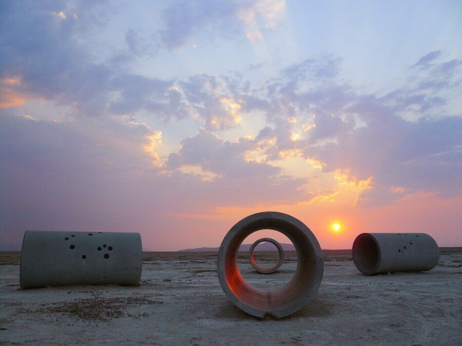 Holt is best known for Sun Tunnels (1976), a large-scale environmental sculpture located in the Utah desert. The work consists of four massive concrete tunnels, each 18 feet long and 9 feet in diameter, arranged in an open X-shaped formation. They are precisely aligned with the rising and setting sun during the summer and winter solstices, creating a direct connection between the artwork, celestial events, and the Earth’s cycles.