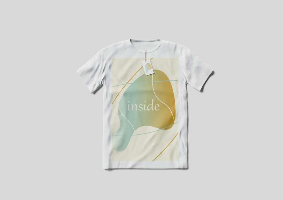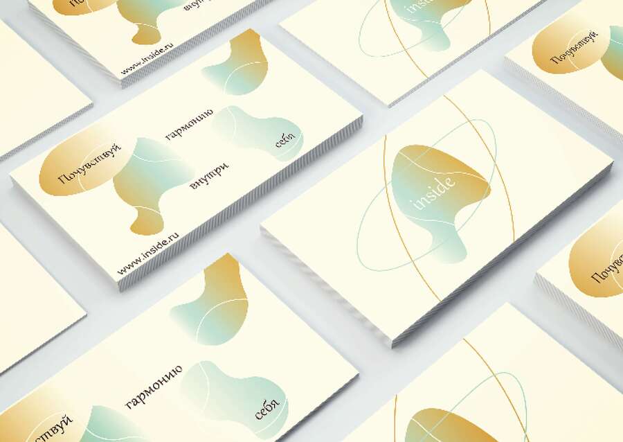 promt: create a layout of printed products (paper, envelope, business cards) on a white background for a perfume brand named Inside. The text on the media is written in Justus roman font. The drawing on the layout with waves, shapeless drops, smooth lines, translucent spheres in the colors black, white, purple, pink, blue