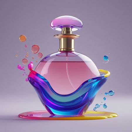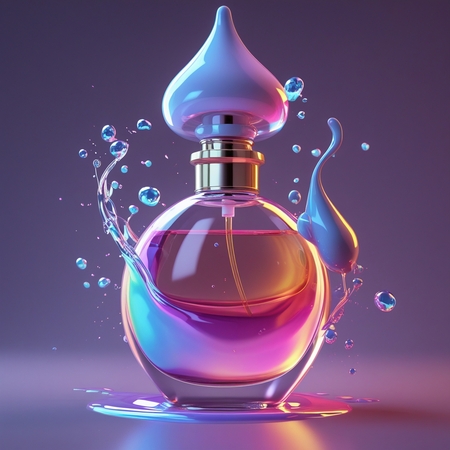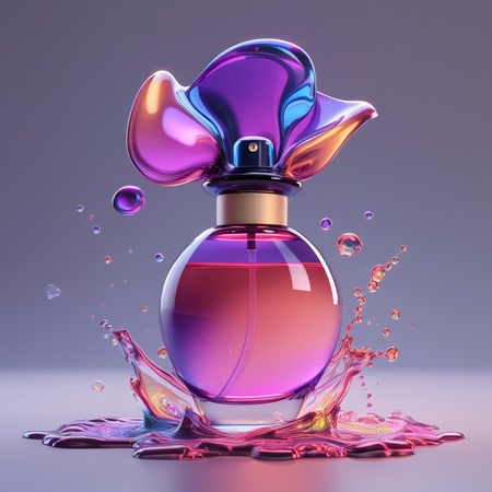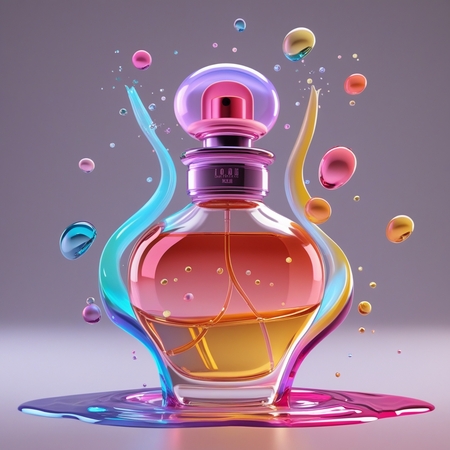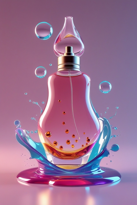 1. promt: create a 3D model of a perfume bottle, it should have an unusual smooth shape, similar to liquid drops, there should be a colored aura around the bottle, which dissipates slightly, liquid with small molecules should be poured into the bottle (1-4 фото)