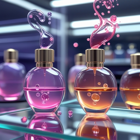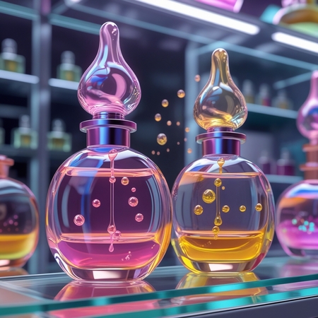 2. promt: create a 3D model of 2 perfume bottles, they should have an unusual smooth shape, similar to liquid drops, there should be a colored aura around the bottle, which dissipates slightly, liquid should be poured into the bottle, small molecules inside the liquid. The vials are on a store glass shelf (5-6 фото)