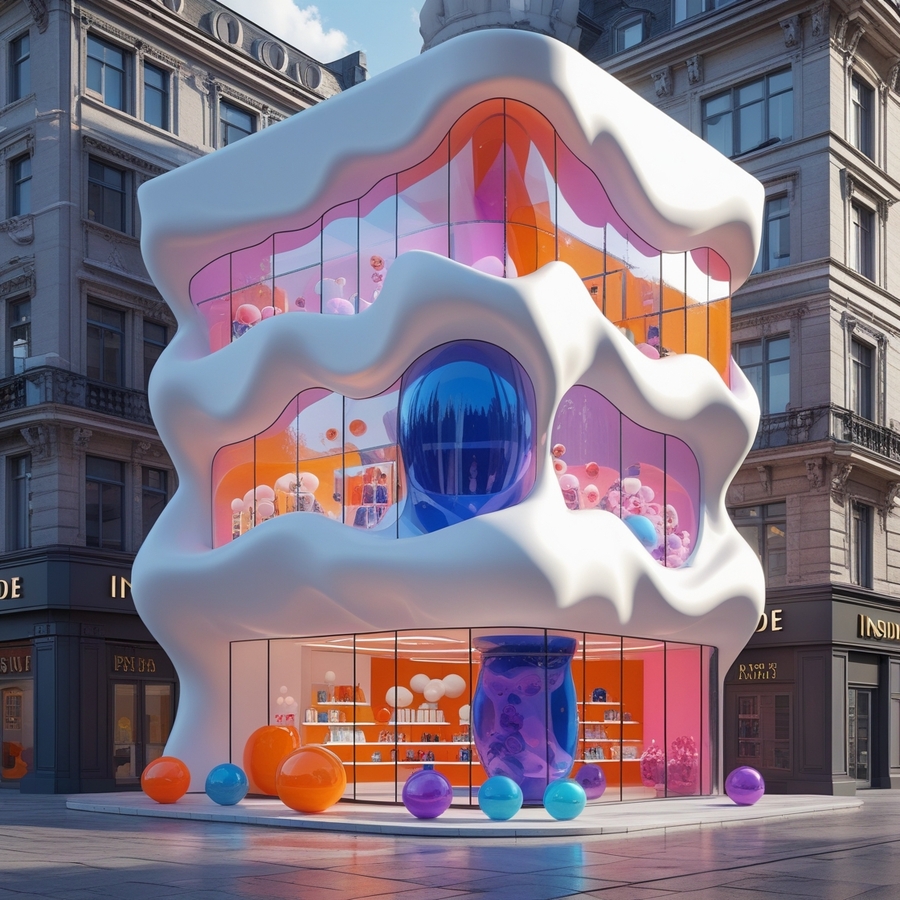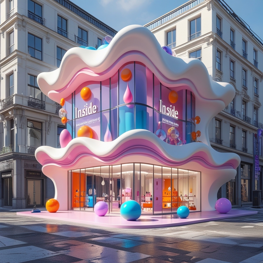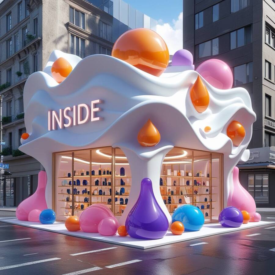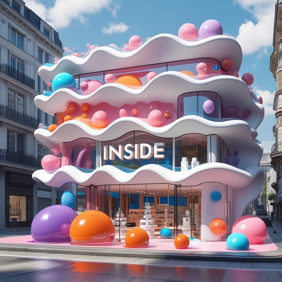 promt: Create a three-dimensional 3D large perfume store building with the name «Inside», made in Justus Roman Font in the city center, there are no other buildings nearby. The appearance is made in the form of waves, and shapeless droplets, spheres of different shapes. The material is white, pink, orange, blue, purple, glass windows. The building looks airy and unusual