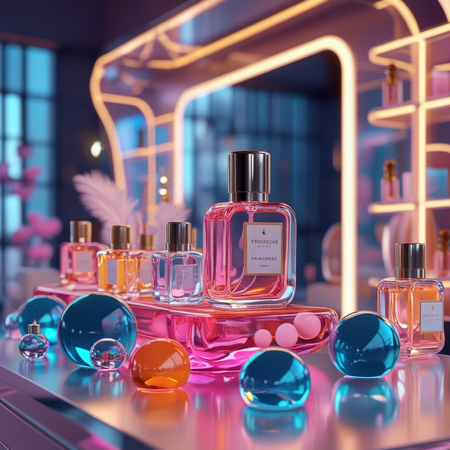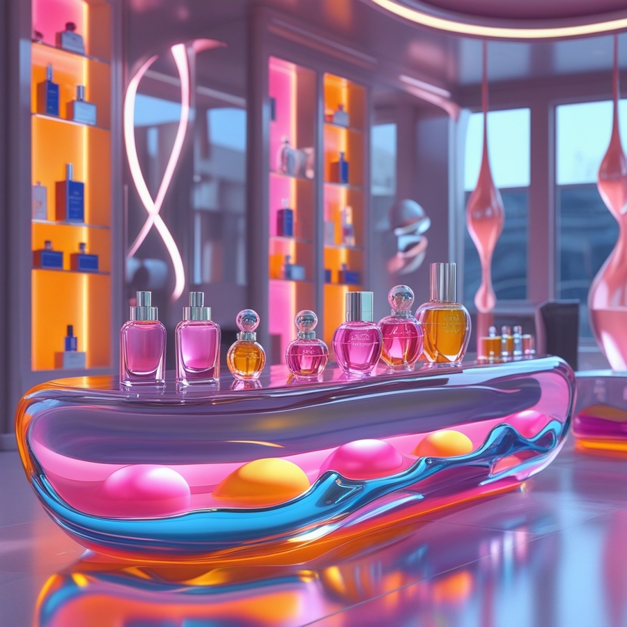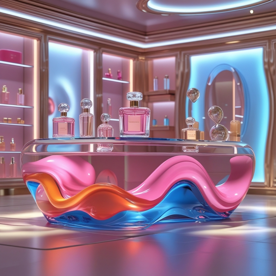 promt: «create a 3D model of the interior of a perfume store, the counter is made of shapeless glass of transparent, pink, blue, orange colors, soft flowing shapes, there are glass perfume bottles in the form of spheres and streamlined drops on the counter, glass spheres and cold diffusing light in the background (сгенерированы 1 и 3 фото)