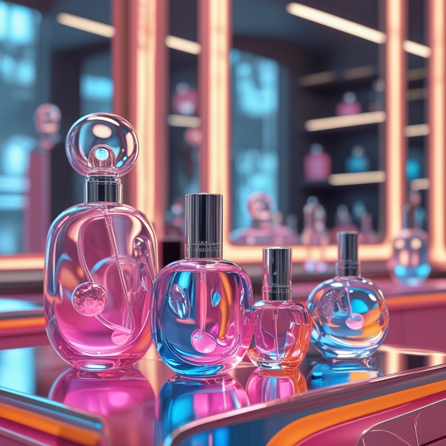 promt: „create a 3D model of the interior of a perfume store, the counter is made of shapeless glass of transparent, pink, blue, orange colors, soft flowing shapes, there are small glass perfume bottles in the form of spheres and streamlined drops on the counter, glass spheres, a large mirror and cold diffusing light in the background (сгенерированы 2 и 4 фото)