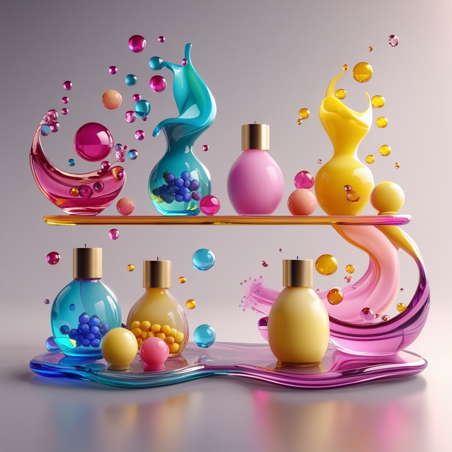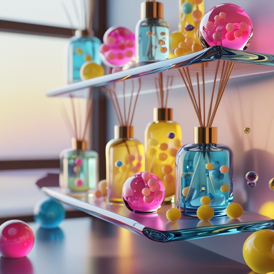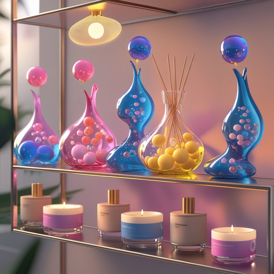 prom: a 3D image of a multi-colored glass shelf with scented candles and diffusers, each of which in an unusual flowing form should contain pink blue yellow glass spheres and molecules. Candles should be made of natural wax, perhaps, and diffusers should have a simple, minimalistic design. The lighting should be neutral, soft and warm, creating a cozy and inviting atmosphere