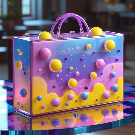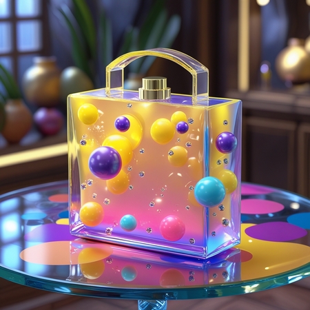 prom: a rectangular bag for a perfume store. The package is luminous and diffusing, with spheres and floating shapes painted on it in yellow, pink, blue and purple colors. The package is on a glass multicolored table