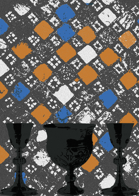 Обработанное изображение средневековой мозаики 12 века используется в печатной продукции бара и в качестве принта.