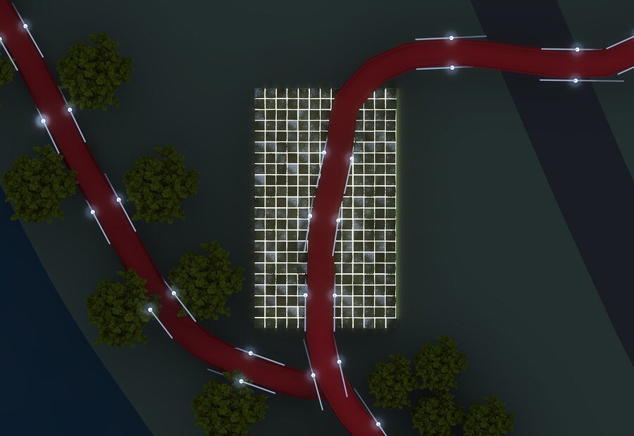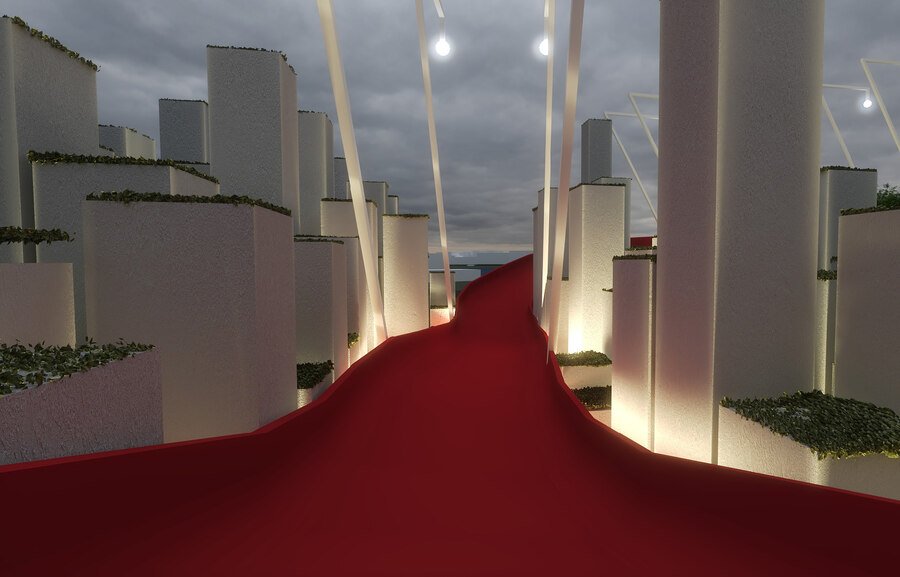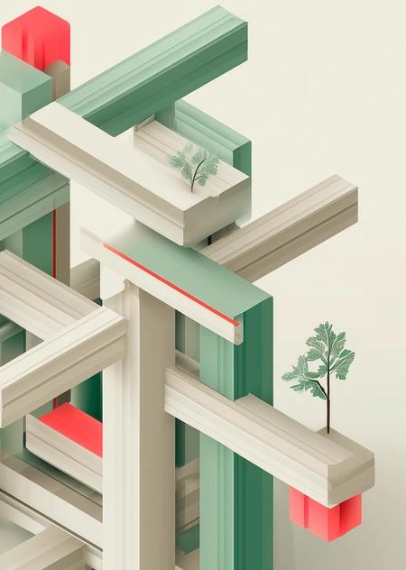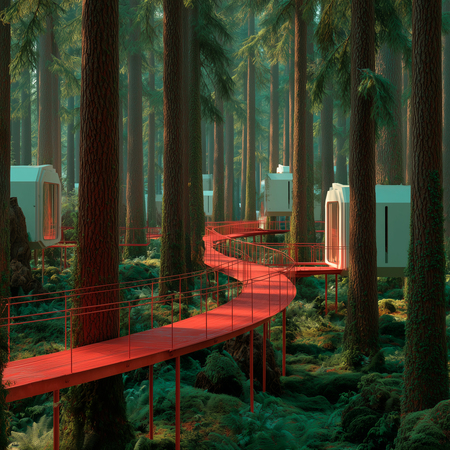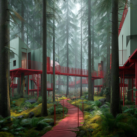 промт- Hyper-realistic photograph of an eco-hotel in a dense forest. A network of vivid crimson-red pedestrian walkways, elevated 3 meters high on slender pillars, weaves between the trees. Geometric mini-cottages on stilts, inspired by Lazar Khidekel’s «City on Stilts» and Malevich’s «Architectons,» are scattered throughout. The buildings feature monolithic, light-colored facades with soft sage-green accents. Sunlight filters through the lush canopy onto the mossy forest floor. Serene, avant-garde architecture integrated with nature. Photorealistic, 8K, detailed.