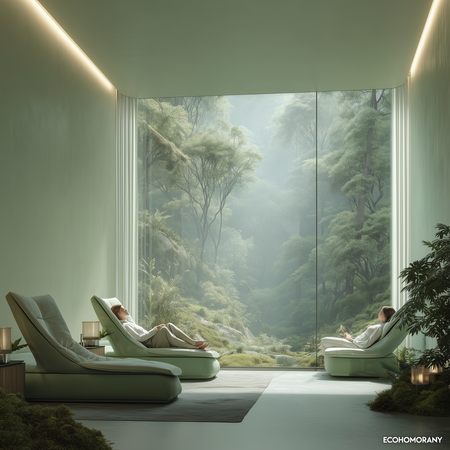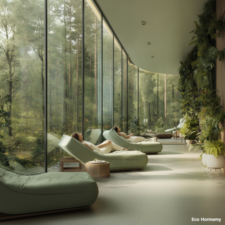 промт- Hyper-realistic photograph of a light-filled wellness room at «EcoHarmony». Patients are relaxing on modern loungers during their therapeutic treatments. The minimalist interior features pastel green accents in the fabrics and decor. A massive floor-to-ceiling window frames a lush, green forest, blending the interior with the exterior. The mood is serene and calming. Photorealistic, 8K, sharp focus