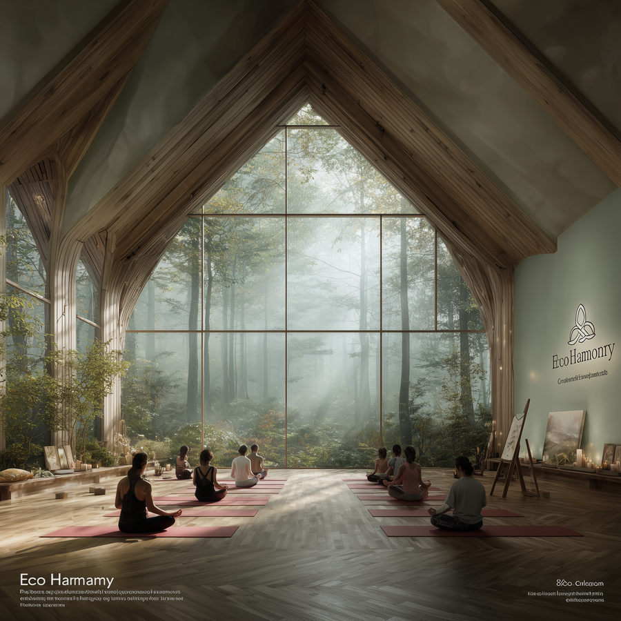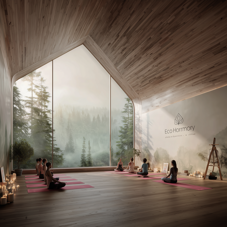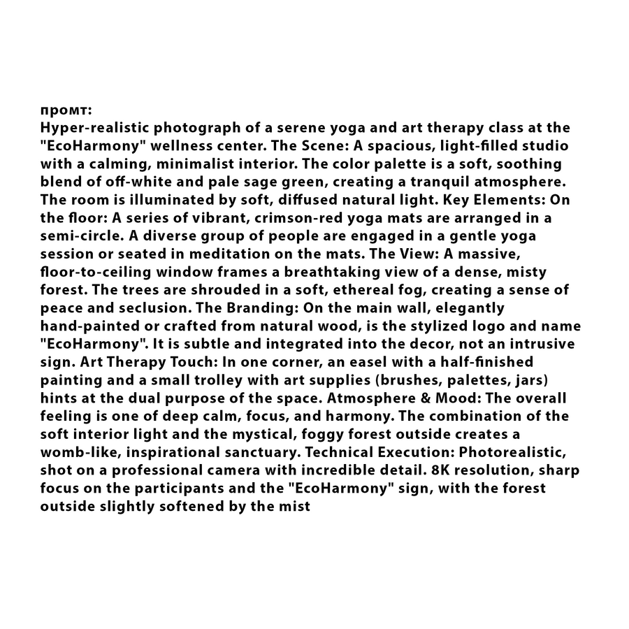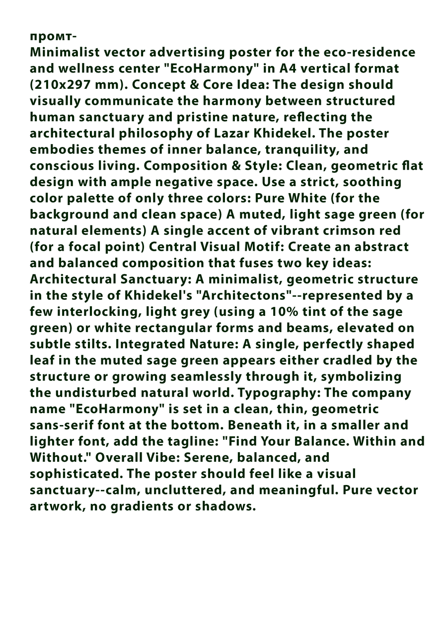 промт- Hyper-realistic photograph of the «EcoHarmony» eco-residence and wellness center at sunrise. A central, geometrically pure building with a green roof and large glass walls is elevated on slender stilts above a misty forest floor, embodying Lazar Khidekel’s architectural philosophy. The scene shows a serene yoga class on a deck overlooking a mirror-calm pond, with the forest enveloping the structure. The materials are warm wood, light stone, and sage-green accents. The atmosphere is one of profound peace, harmony, and conscious living. Sunbeams pierce the morning mist. Photorealistic, 8K, incredibly detailed.