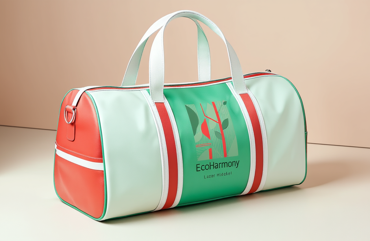 промт для сумки- Mockup of a sport bag and write the EcoHarmony logo. Use pastel greeen, white and red colors Сгенерировано при момощи Recraft.ai
