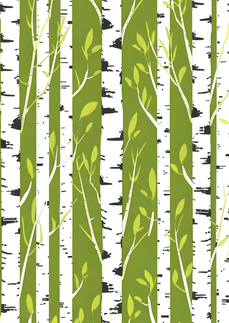 Generate a pattern, minimalism, 2d vector image without unnecessary details, limited color palette up to 3: white, black and green. Birch black-and-white trunks on a green background stand vertically. Light green birch leaves are visible. All colors should be harmoniously combined with each other. The pattern must be in high resolution, suitable for printing.