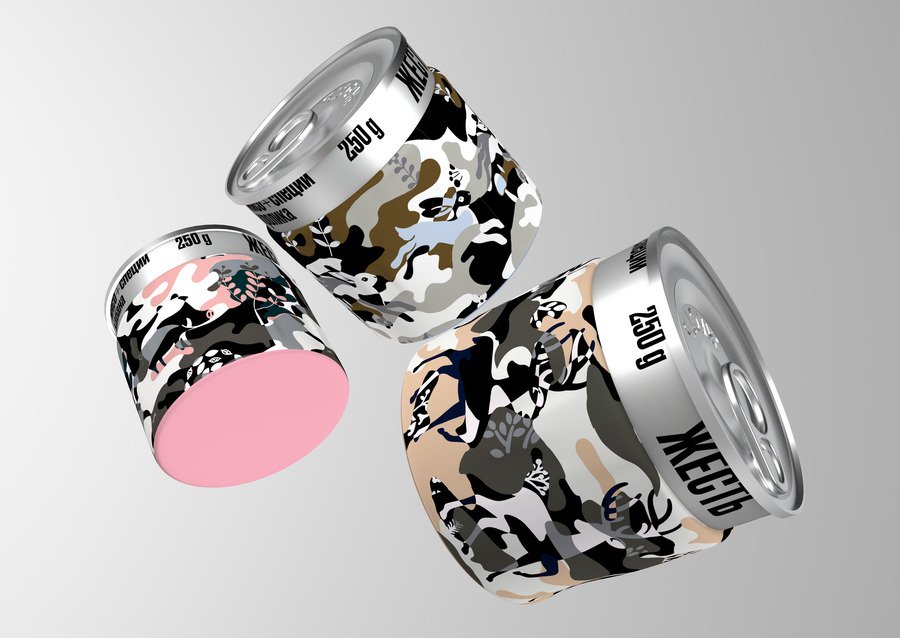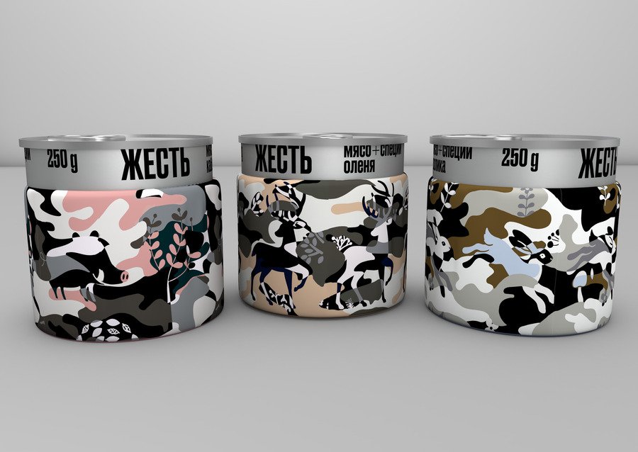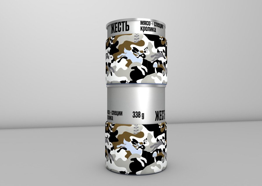 «Жесть» — бренд консервов, которые производятся из мяса лесных животных (оленя, кабана, кролика). Фишка упаковки этих консервов заключается в наличии тканевого «стаканчика», выполняющего термоизолирующую функцию.