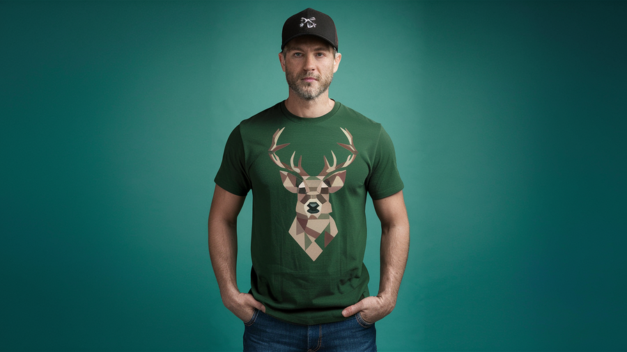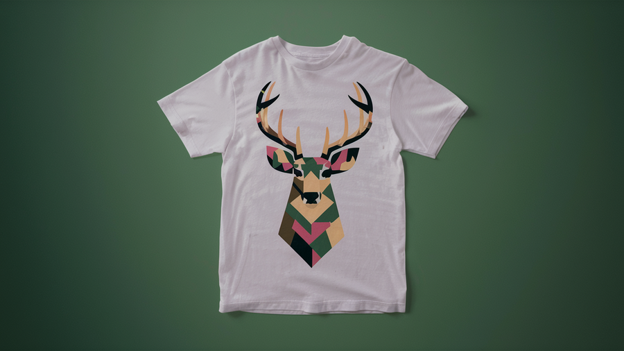 8. Генерирую футболки в ideogram. Промпт: «the image of a T-shirt with a deer made of flat geometric shapes, camouflage, focus on the product, photo studio, uniform light»;