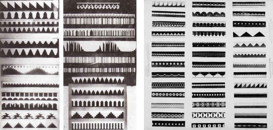 Арсений Авраамов, рисованный звук, 1930-1931; Оскар Фишингер, фрагмент демонстрационной карточки для экспериментов «Орнаментальный звук», ок. 1931; Рудольф Пфеннингер, рисованный звук, ок. 1931