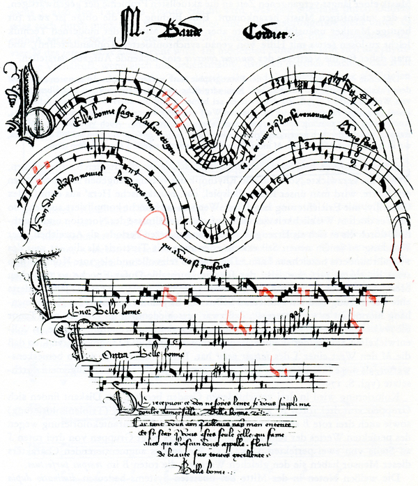 Бод Кордье, рондо «Прекрасная, добрая, мудрая» (Belle, bonne, sage), кон. XIV — нач. XV вв.; Бод Кордье, рондо «Всё мною создано циркулем» (Tout par compas suy composés), кон. XIV — нач. XV вв.