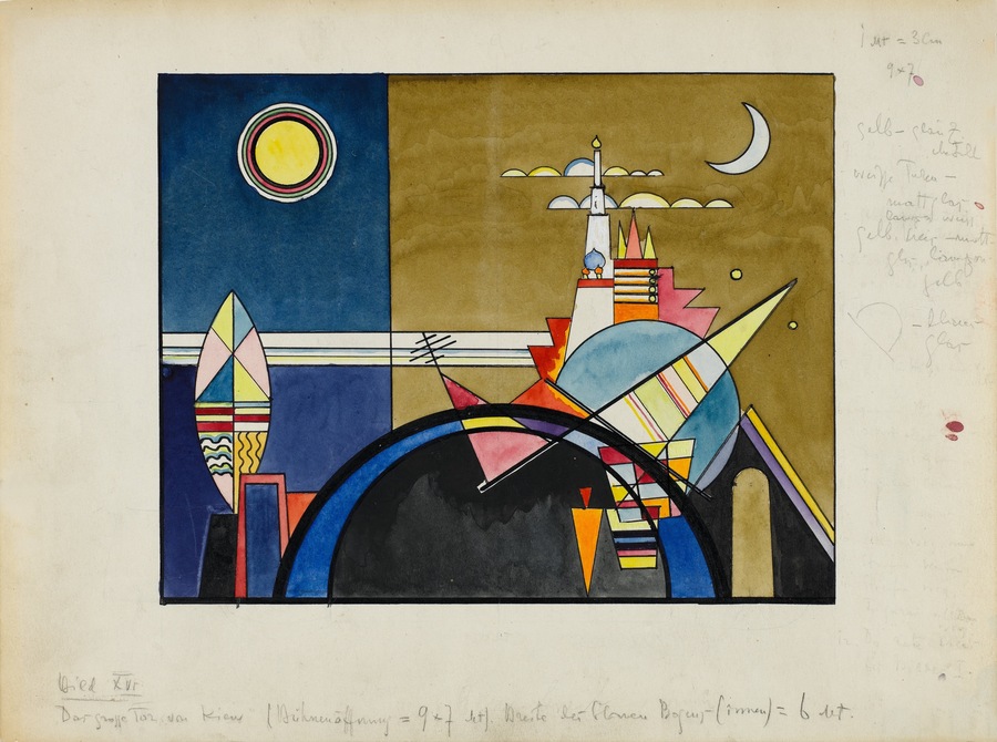 Василий Кандинский реализовывал своё синестетическое видение и в сценографии к опере Модеста Мусоргского «Картинки с выставки» (1928). Он создал визуальные партитуры, на которых абстрактные композиции, геометрические формы и цветовые плоскости динамически соответствовали фрагментам музыки. Так, острые формы передавали хаотичные ритмы, а монументальные фигуры — торжественные аккорды, что позволило ему точно передать характер постановки.
