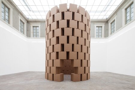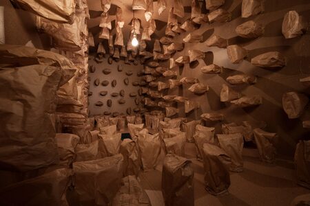 Зимун, «186 подготовленных DC-моторов, ватные шарики, картонные коробки 60×60×60 см», 2013; Зимун, «317 подготовленных DC-моторов, бумажные пакеты, контейнер для перевозки», 2016