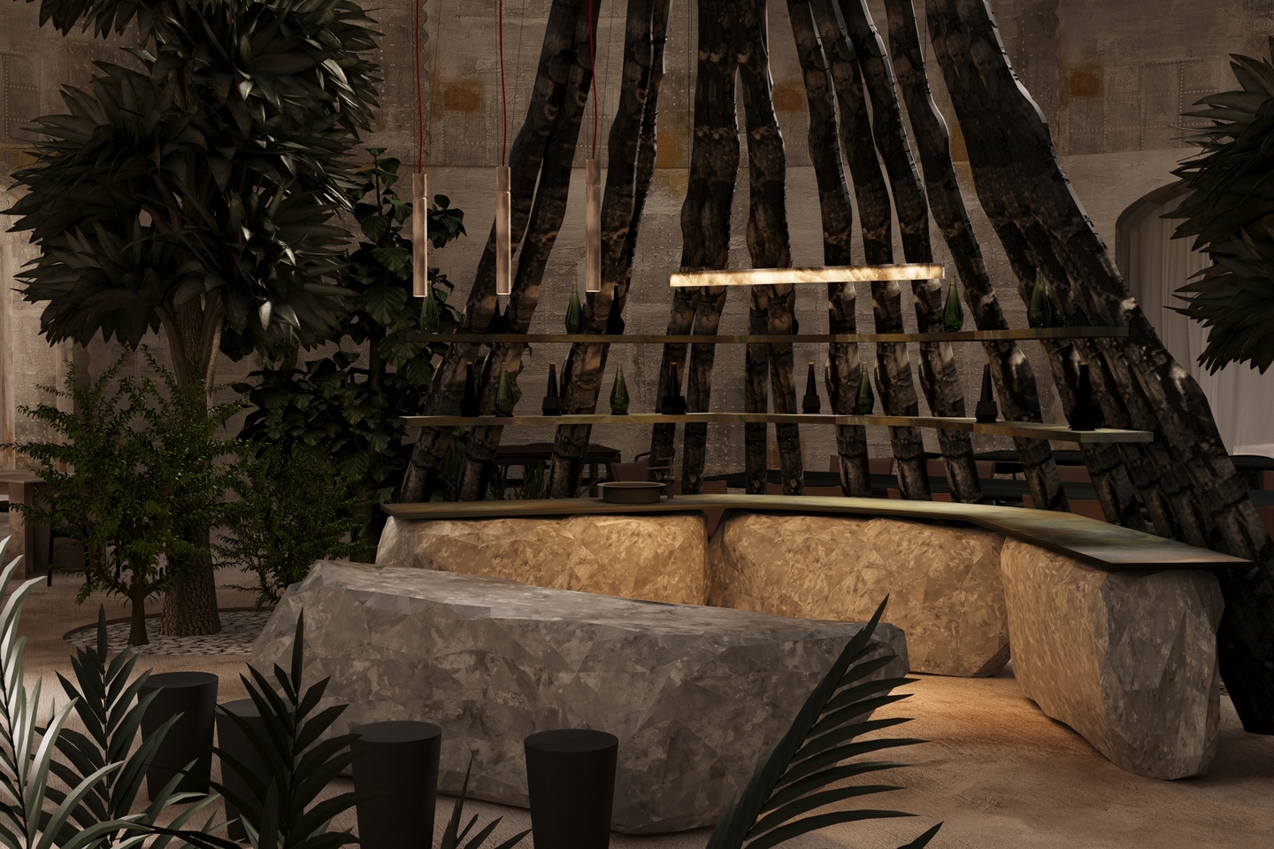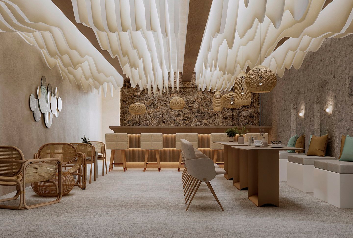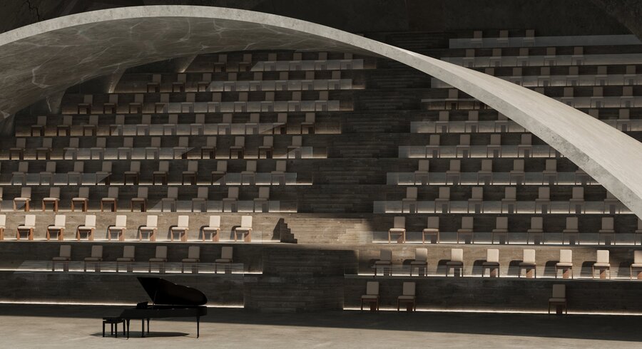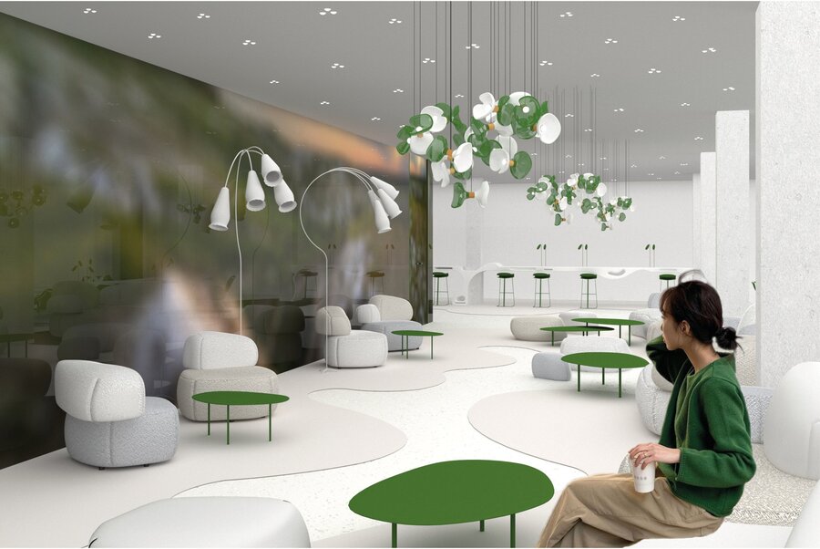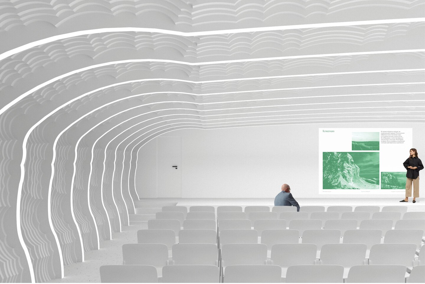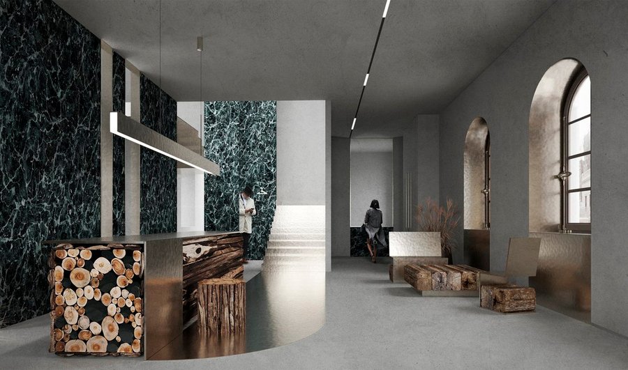 В проекте форма следует за окружающей средой. Источником образов стали меловые горы и их удивительная экосистема. В интерьерах много природных элементов и текстур. Некоторые из форм были созданы из частей кретофильных растений.