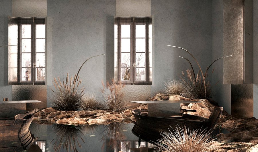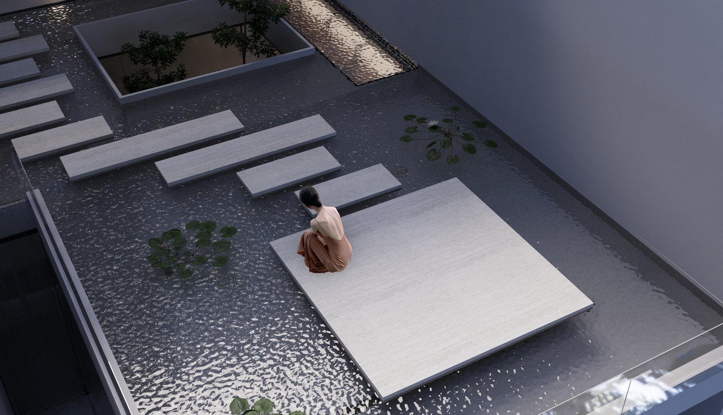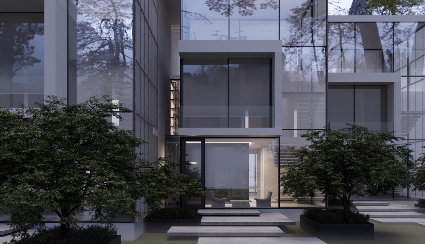 Проект представляет из себя разработку фасада, экстерьера и интерьера таунхауса. Концептуальное решение, проходящее через весь проект — расположение водоема на крыше, вода из которого стекает словно водопадами вниз, которые можно увидеть как снаружи, так и внутри здания.