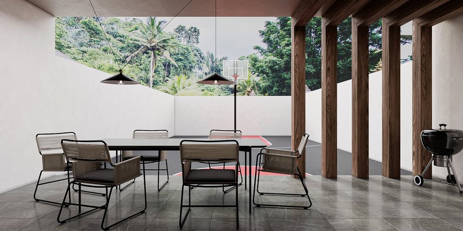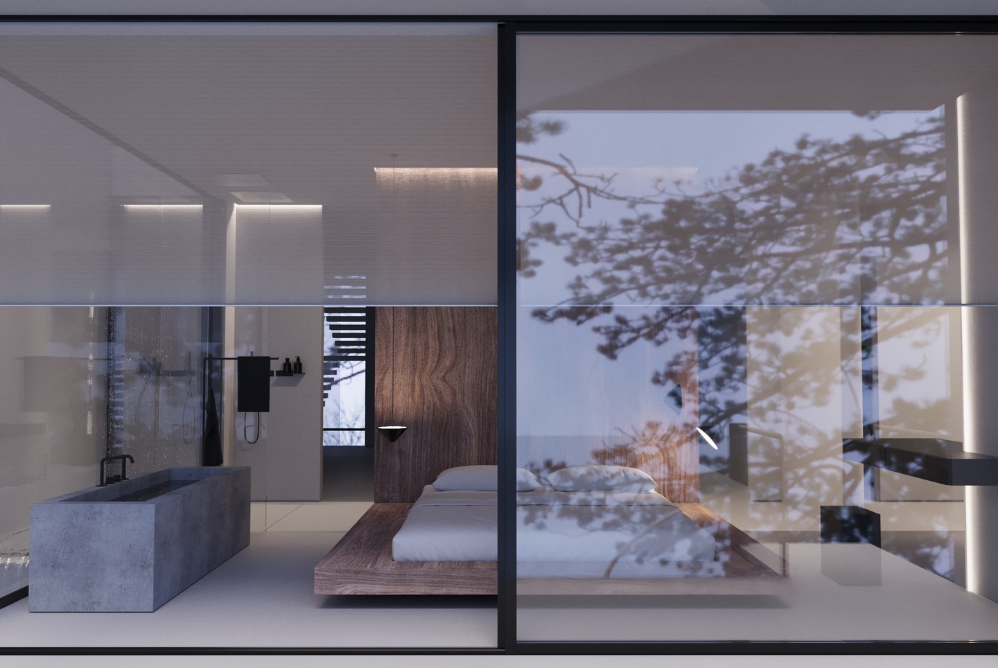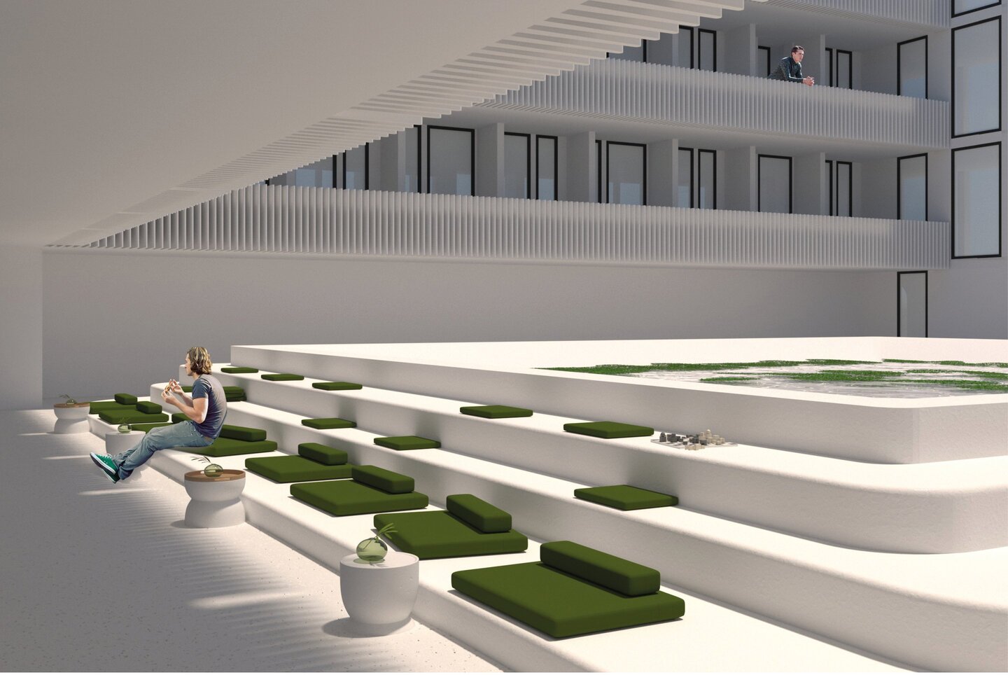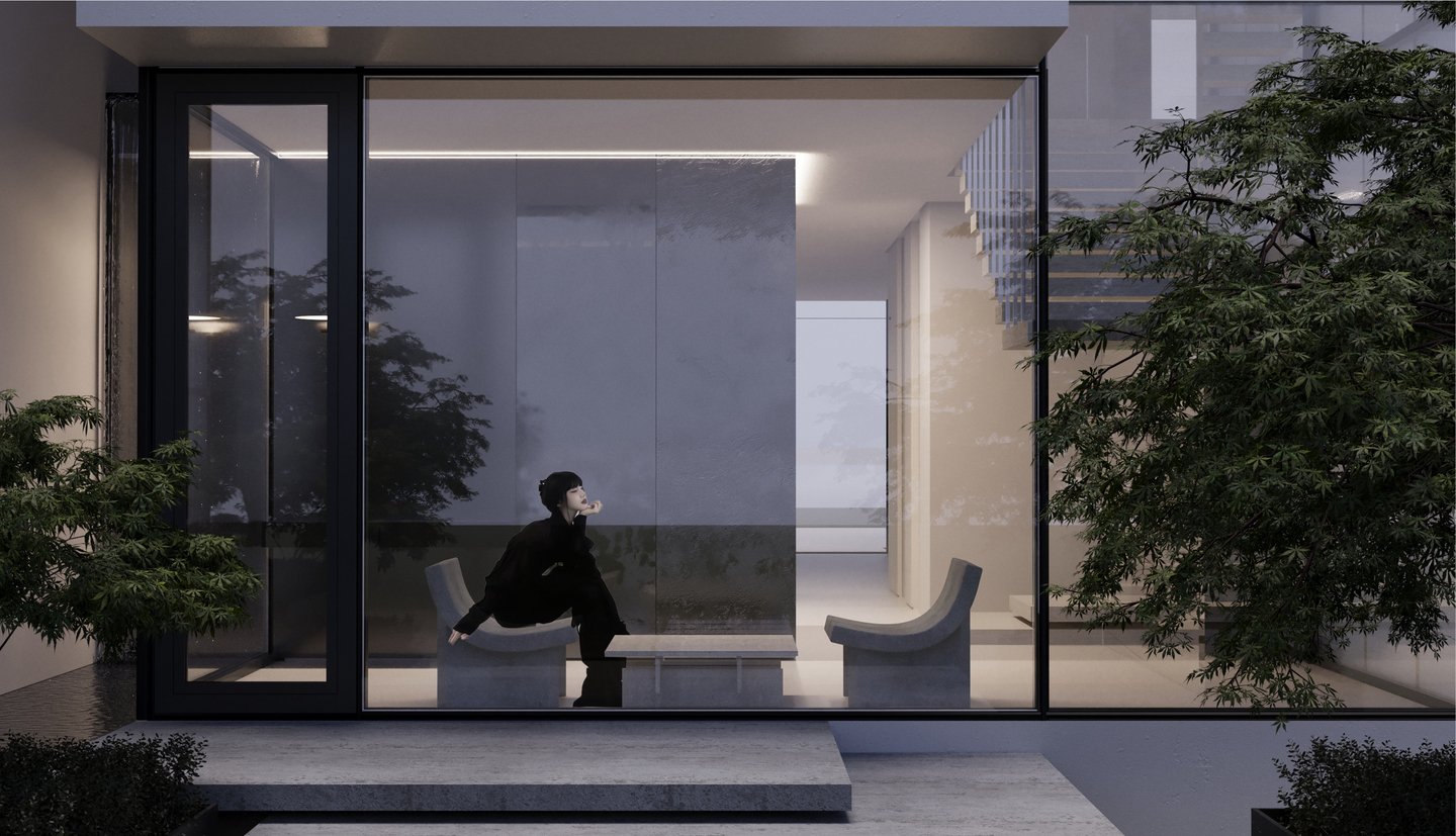 Проект представляет из себя разработку фасада, экстерьера и интерьера таунхауса. Концептуальное решение, проходящее через весь проект — расположение водоема на крыше, вода из которого стекает словно водопадами вниз, которые можно увидеть как снаружи, так и внутри здания.