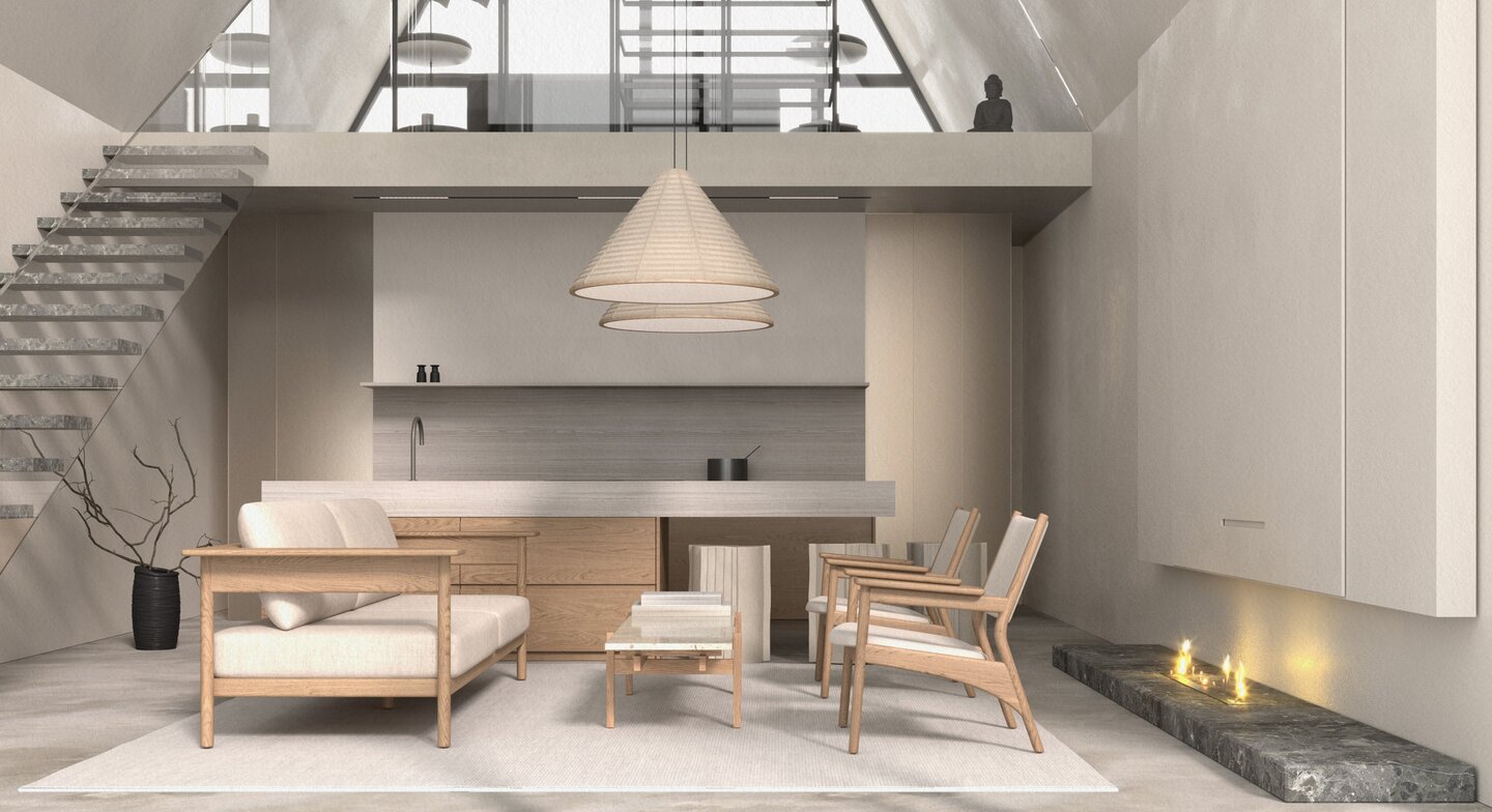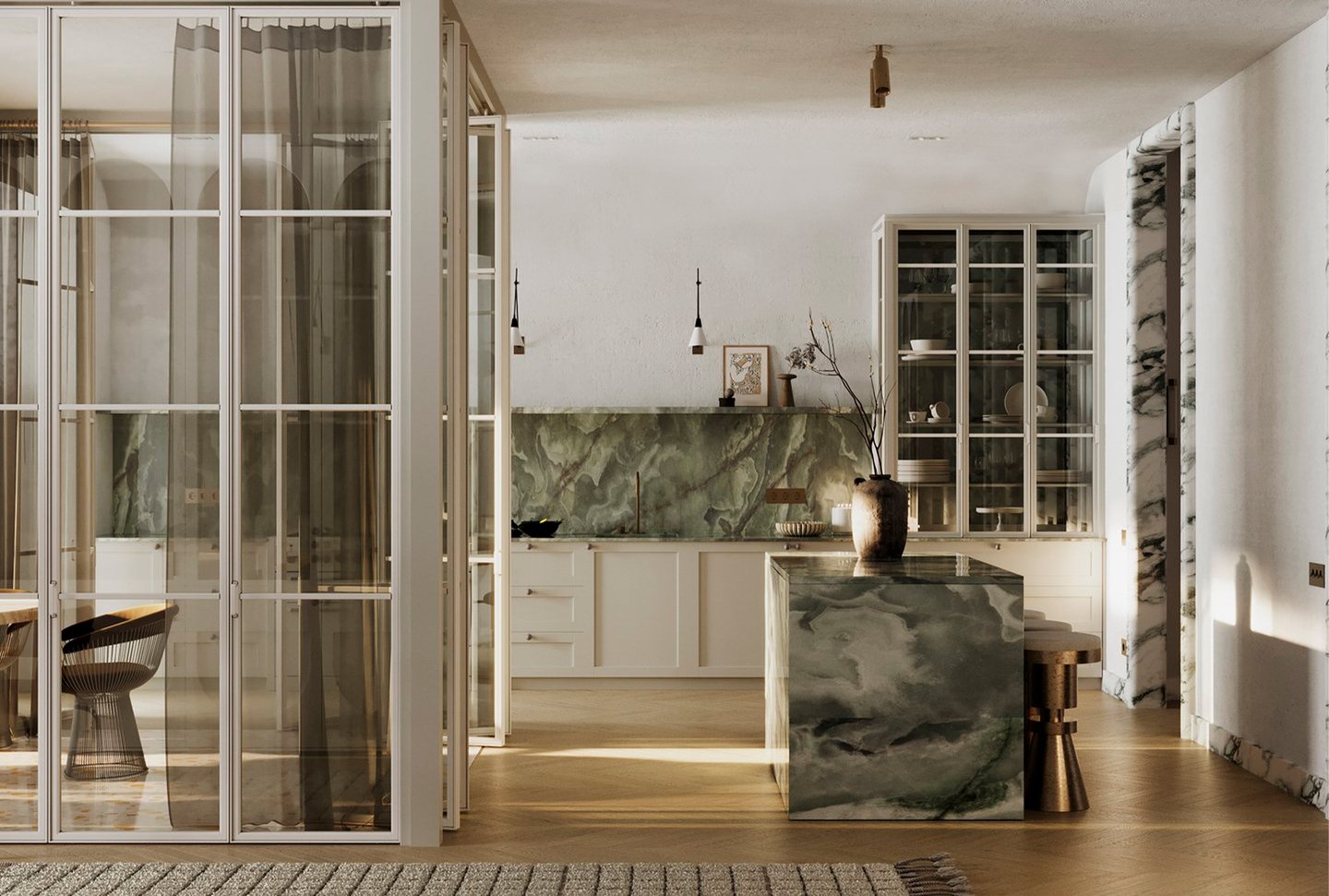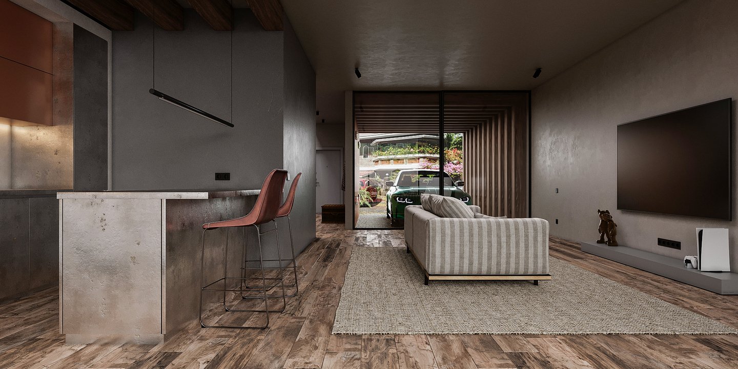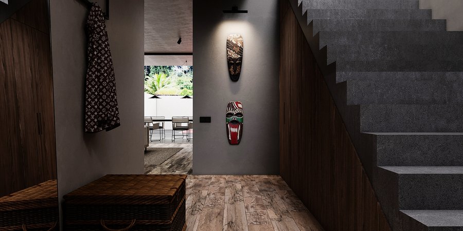 Апартаменты класса люкс для молодой семьи. Основной запрос — интерьер должен быть живым, неповторимым, очень личным, атмосферным, отражающим внутренний мир заказчиков. Концепция — биофильный интерьер, предусматривающий наполненность пространства растениями, природными формами, материалами и всем, что может как-то отсылать к естественной окружающей среде.