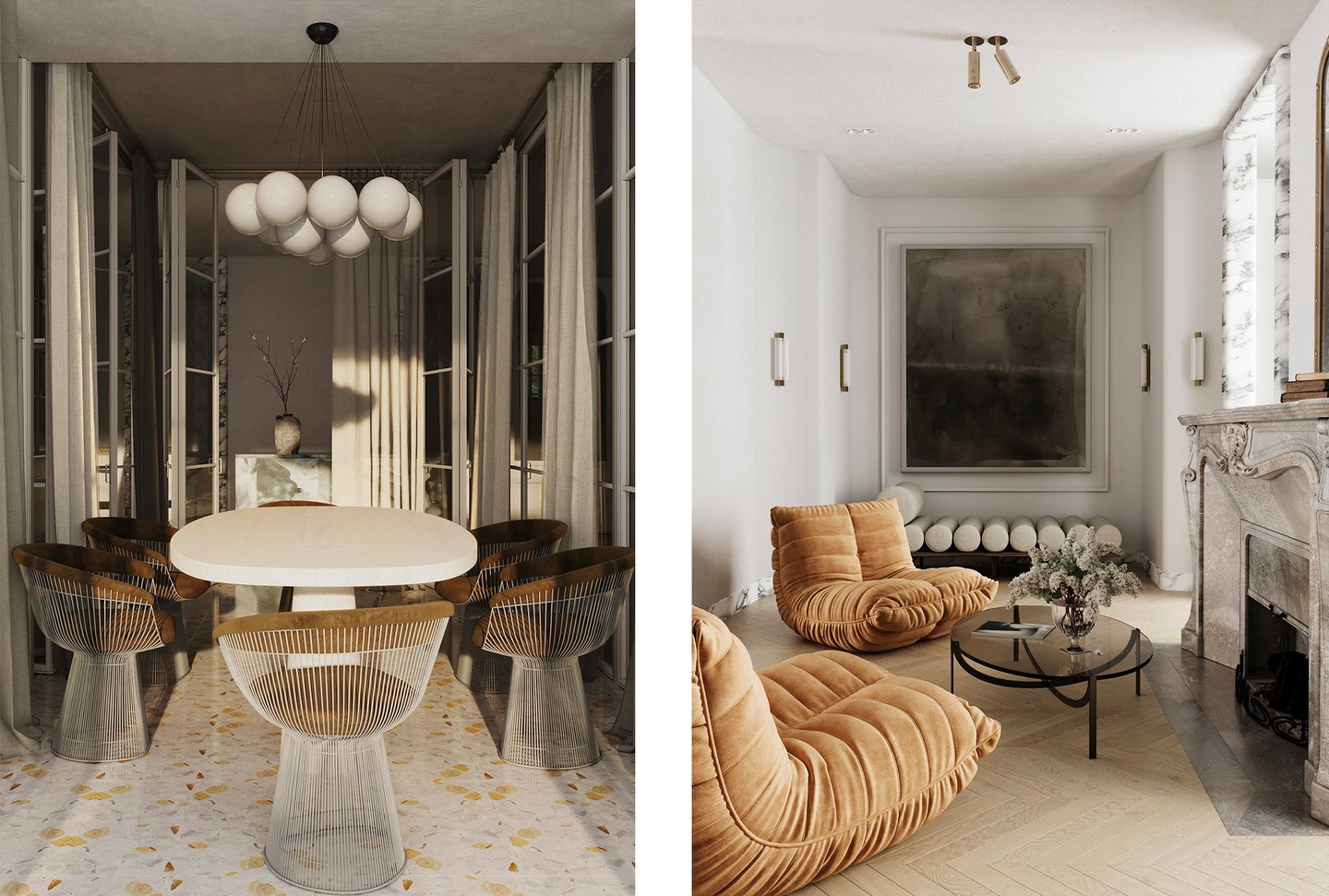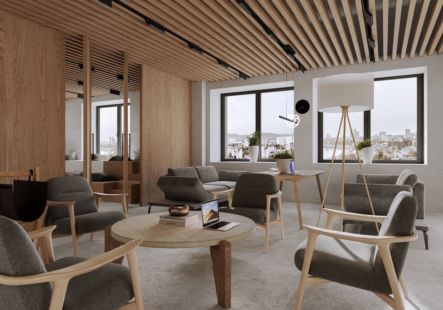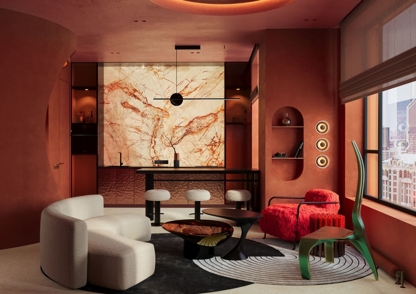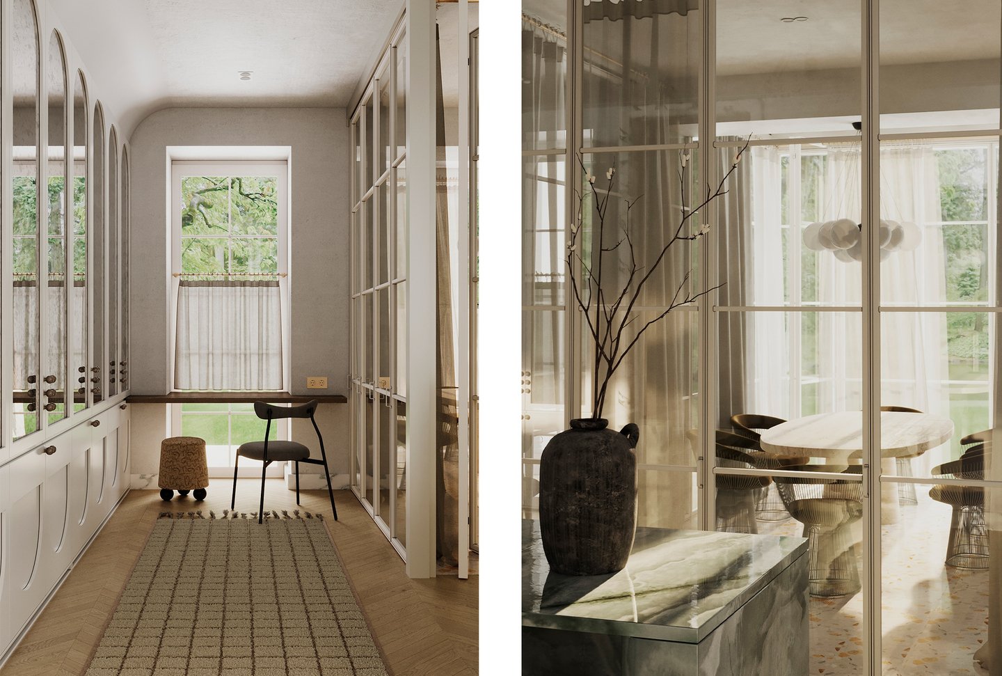 Апартаменты класса люкс для молодой семьи. Основной запрос — интерьер должен быть живым, неповторимым, очень личным, атмосферным, отражающим внутренний мир заказчиков. Концепция — биофильный интерьер, предусматривающий наполненность пространства растениями, природными формами, материалами и всем, что может как-то отсылать к естественной окружающей среде.
