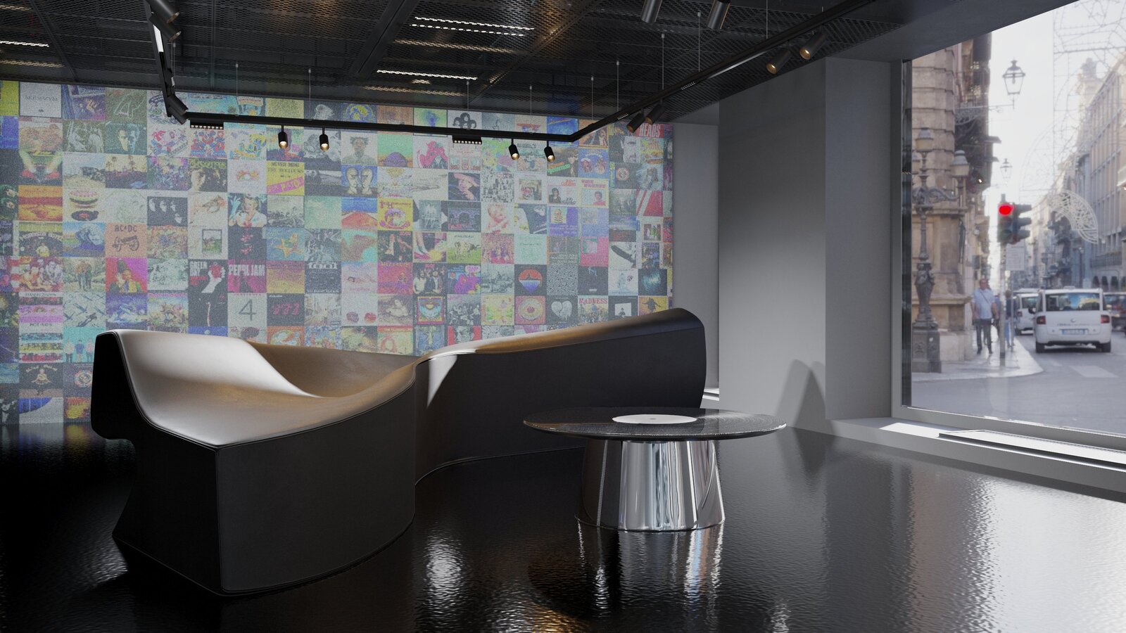 При создании магазина виниловых пластинок главной задачей стало упрощение выбора и улучшение хранения, так чтобы покупатели при поиски пластинки сразу видели все пластинки перед собой на большом экране и не перебирали каждую по отдельности в поисках нужной.
