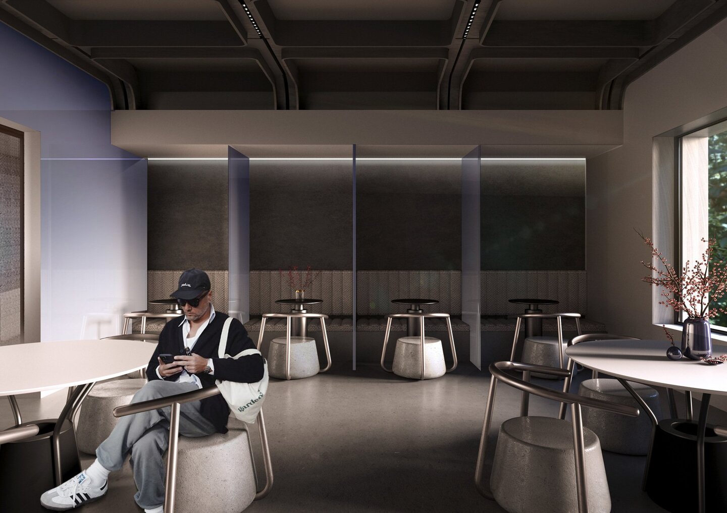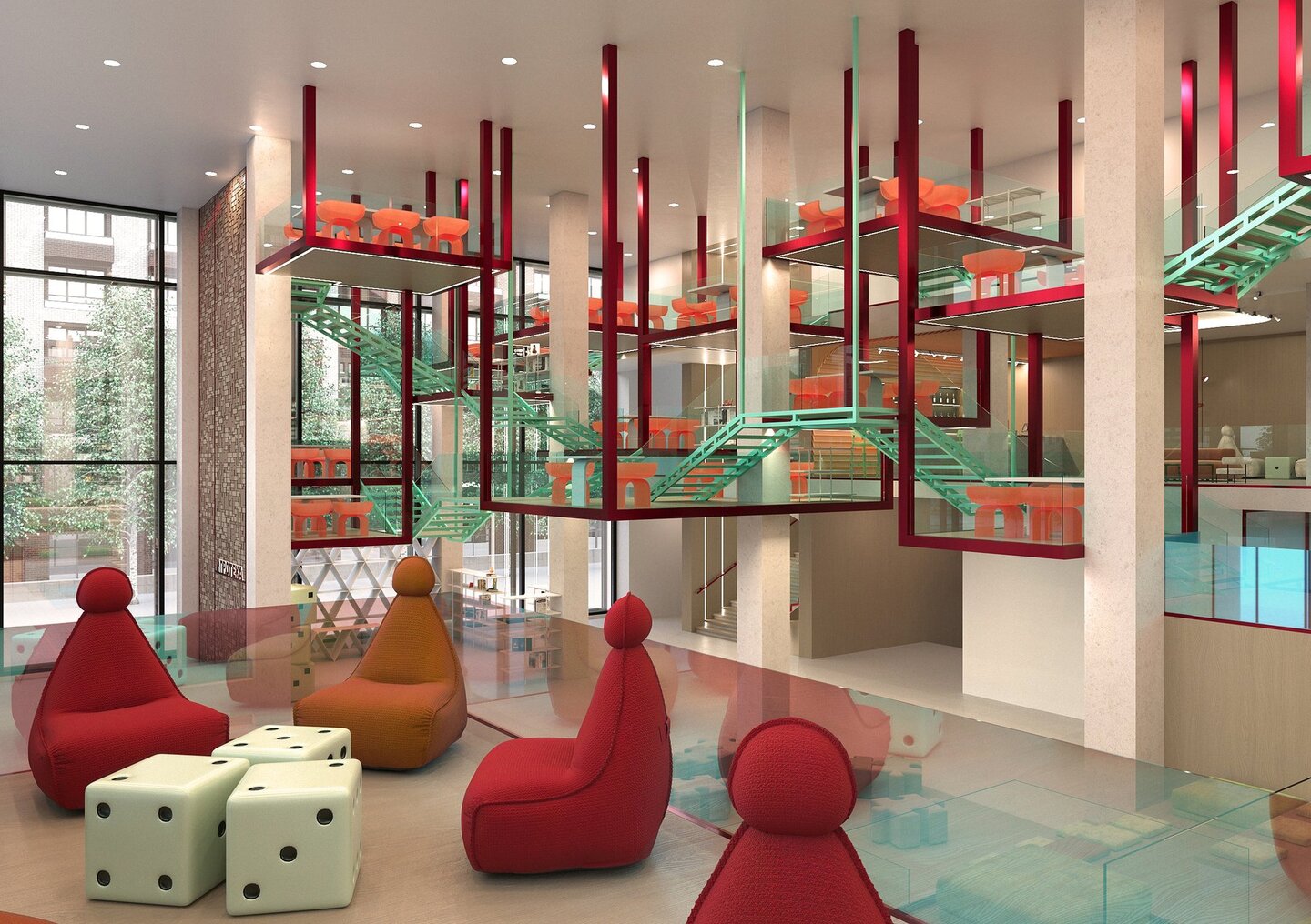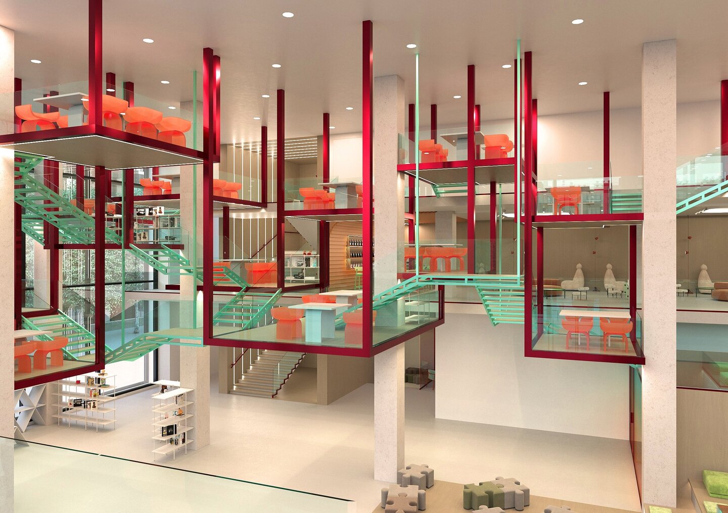 Пространство устроено по принципу большой квартиры — основные зоны выполняют функции комнат (от детской до кабинета), таким образом создавая общественное пространство, наполненное уютом и комфортом, которое позволяет человеку в привычной домашней атмосфере отдохнуть от рутины и обрести новые социальные связи